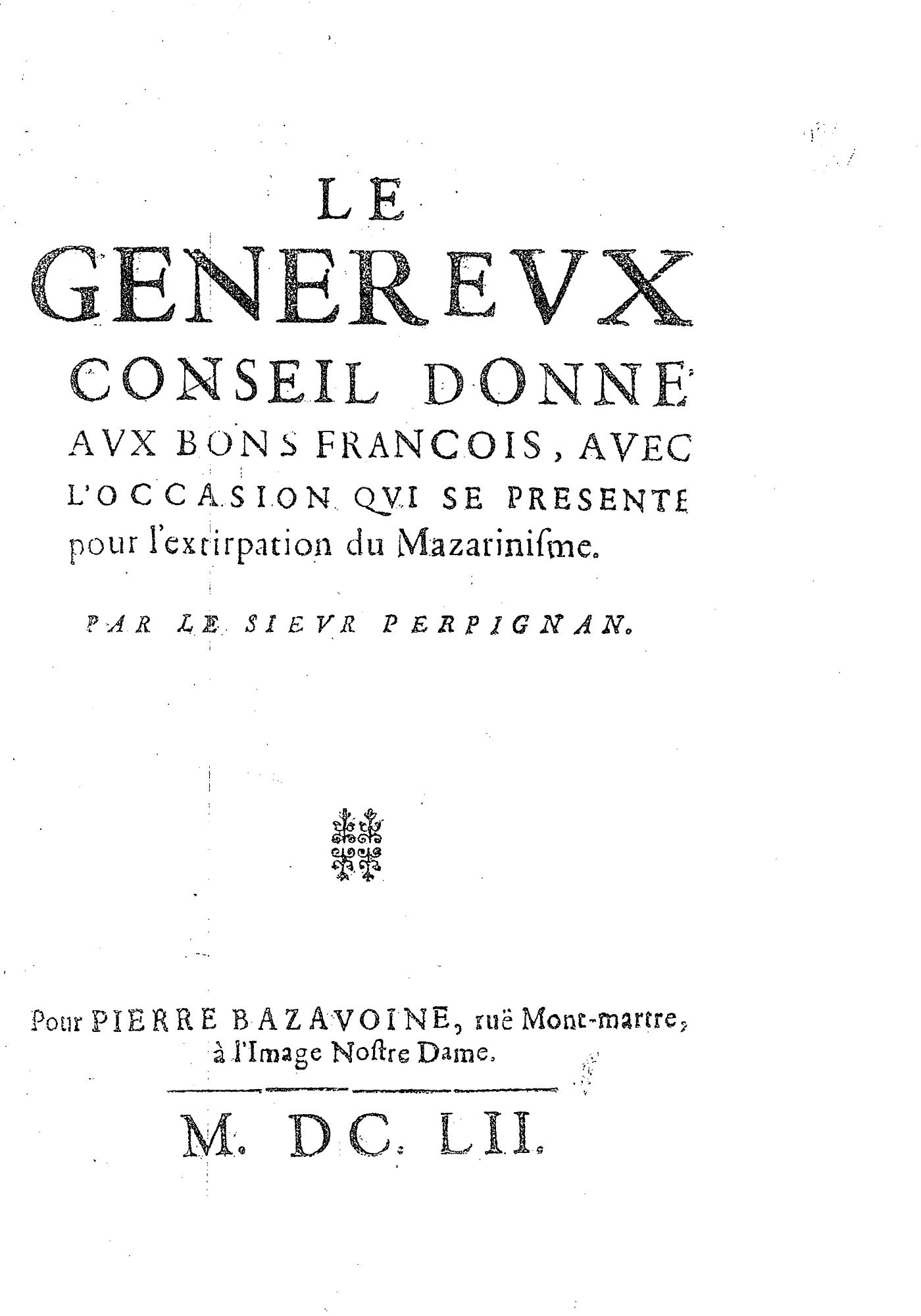LE GENEREVX CONSEIL DONNÉ AVX BONS FRANCOIS, AVEC L’OCCASION QVI SE PRESENTE pour l’extirpation du Mazarinisme. PAR LE SIEVR PERPIGNAN.