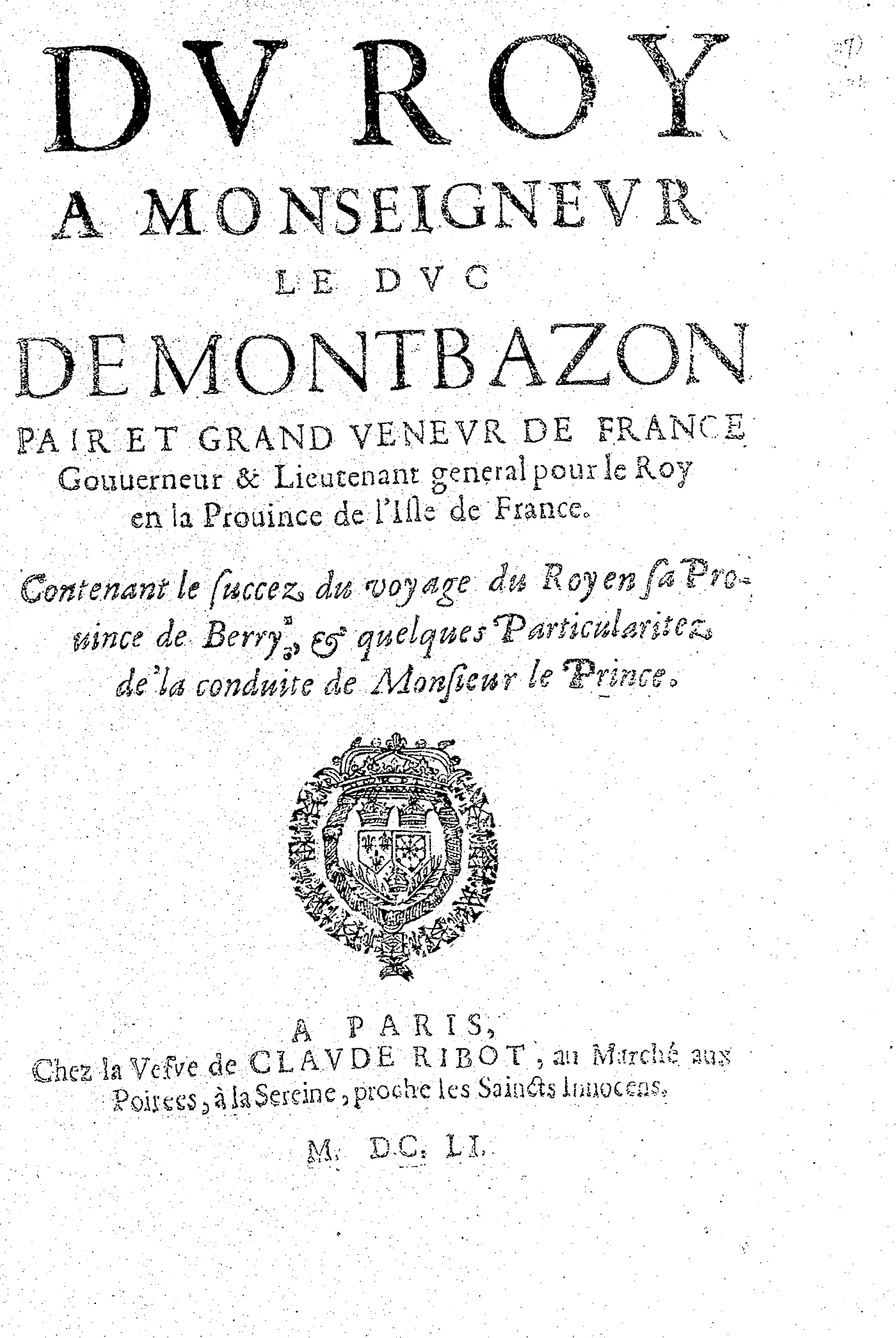 LETTRE DV ROY A MONSEIGNEVR LE DVC DE MONTBAZON PAIR ET GRAND VENEVR DE FRANCE Gouuerneur & Lieutenant general pour le Roy en la Prouince de l’Isle de France. Contenant le succez du voyage du Roy en sa Prouince de Berry, & quelques Particularitez de la conduite de Monsieur le Prince.