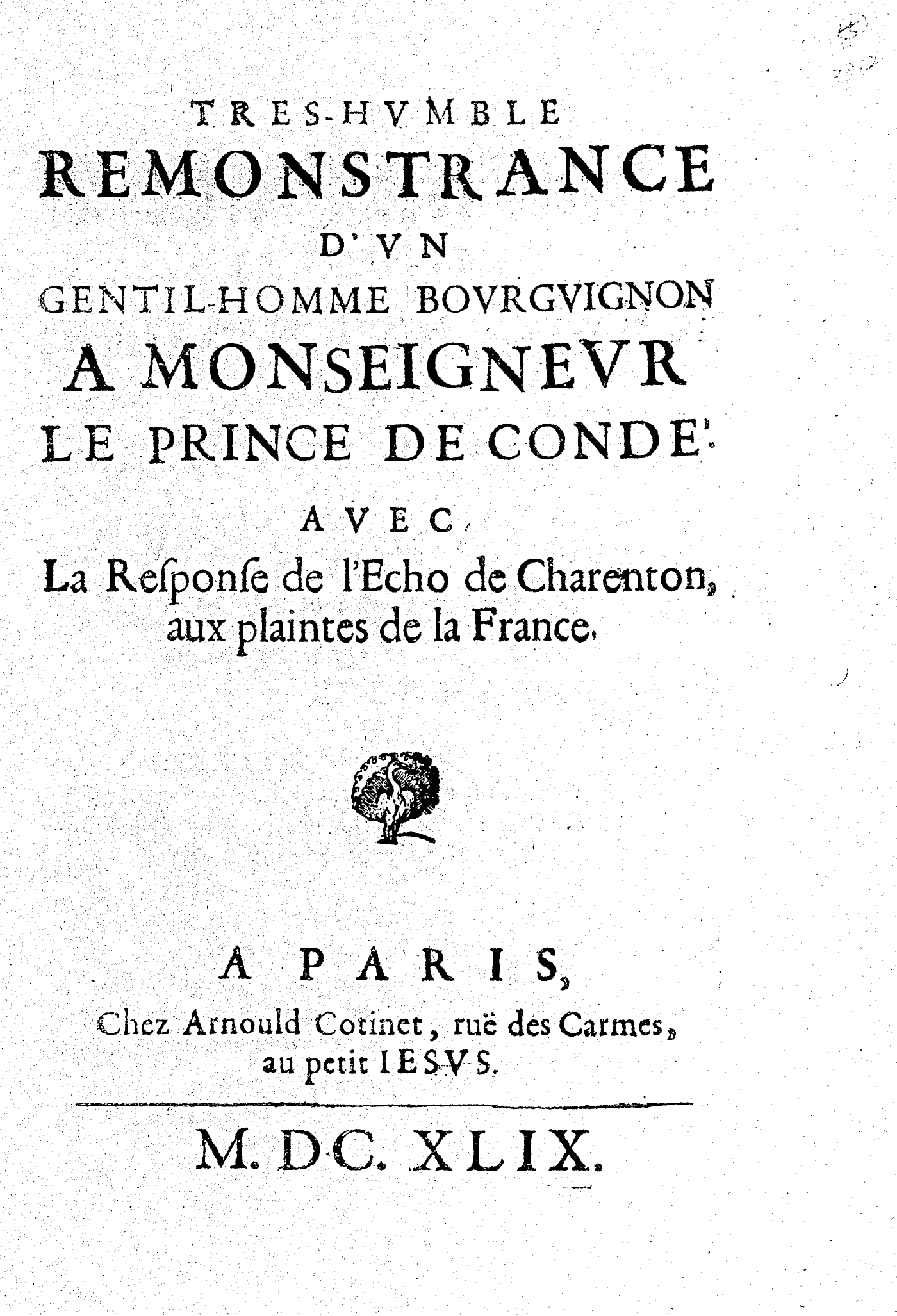 TRES-HVMBLE REMONSTRANCE D’VN GENTIL-HOMME BOVRGVIGNON A MONSEIGNEVR LE PRINCE DE CONDÉ. AVEC La Response de l’Echo de Charenton, aux plaintes de la France.