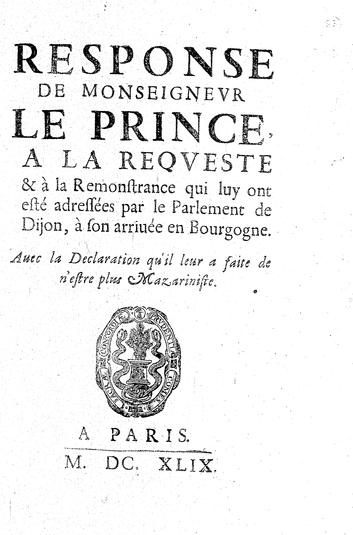 RESPONSE DE MONSEIGNEVR LE PRINCE, A LA REQVESTE & à la Remonstrance qui luy ont esté adressées par le Parlement de Dijon, à son arriuée en Bourgogne. Auec la Declaration qu’il leur a faite de n’estre plus Mazariniste.