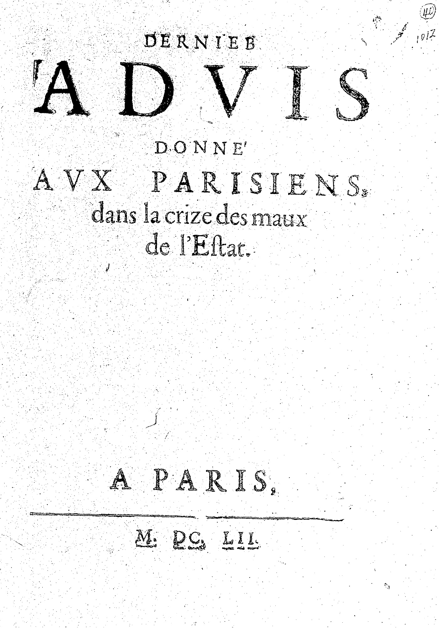 DERNIER ADVIS DONNÉ AVX PARISIENS, dans la crize des maux de l’Estat.
