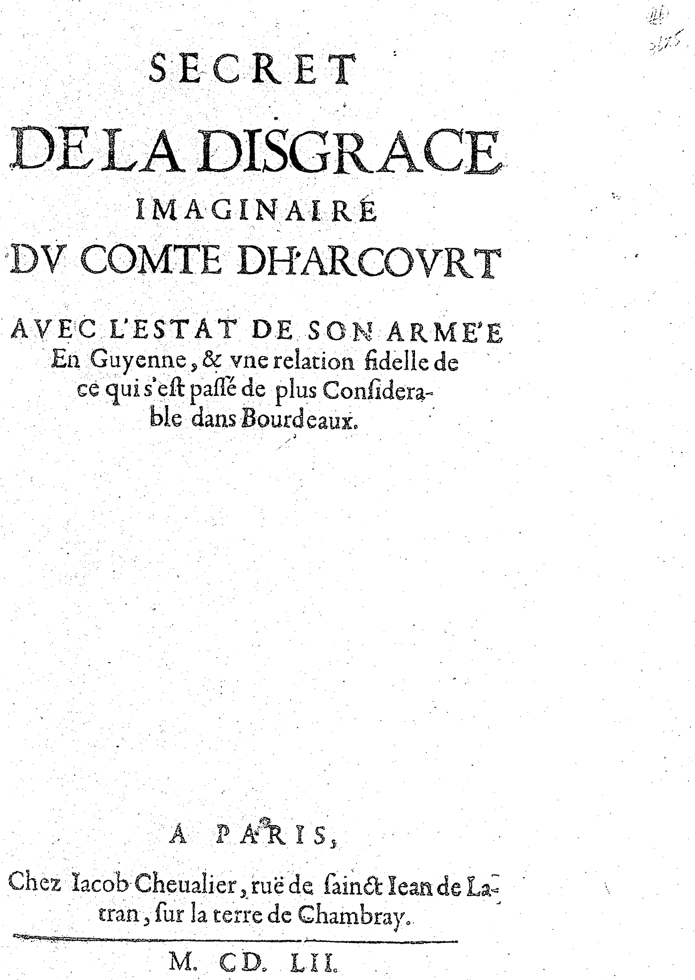 SECRET DE LA DISGRACE IMAGINAIRE DV COMTE D’HARCOVRT AVEC L’ESTAT DE SON ARMÉE En Guyenne, & vne relation fidelle de ce qui s’est passé de plus Considerable dans Bourdeaux.
