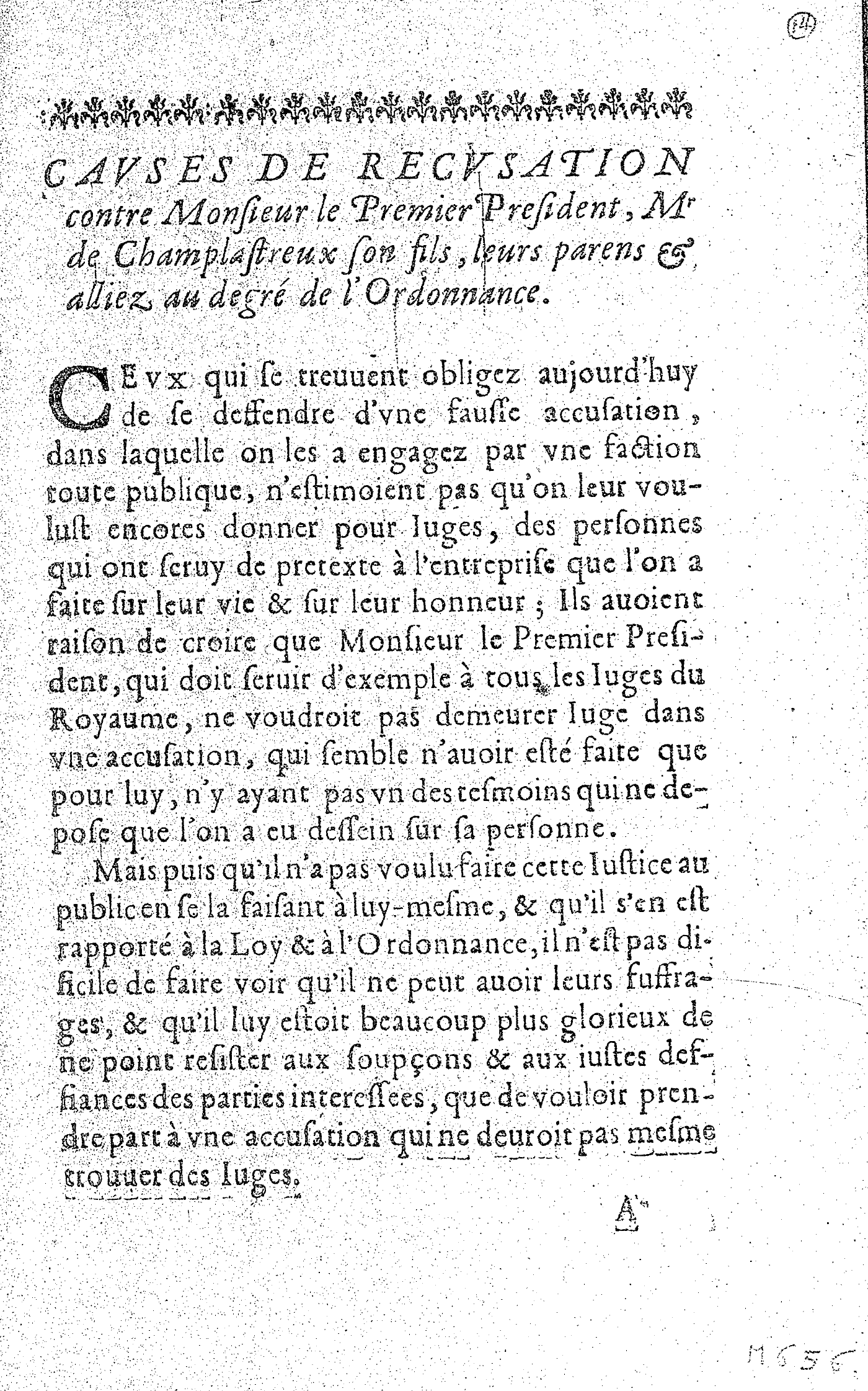 CAVSES DE RECVSATION contre Monsieur le Premier President, Mr de Champlastreux son fils, leurs parens & alliez au degré de l’Ordonnance.