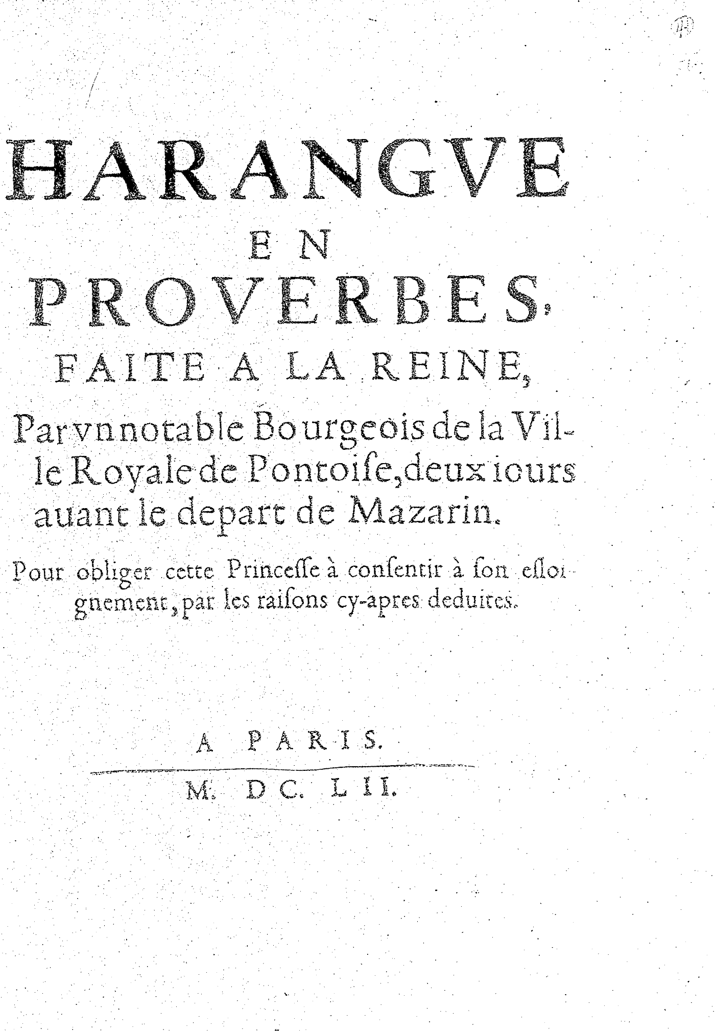 HARANGVE EN PROVERBES, FAITE A LA REINE, Par vn notable Bourgeois de la Ville Royale de Pontoise, deux iours auant le depart de Mazarin. Pour obliger cette Princesse à consentir à son esloignement, par les raisons cy-apres deduites.