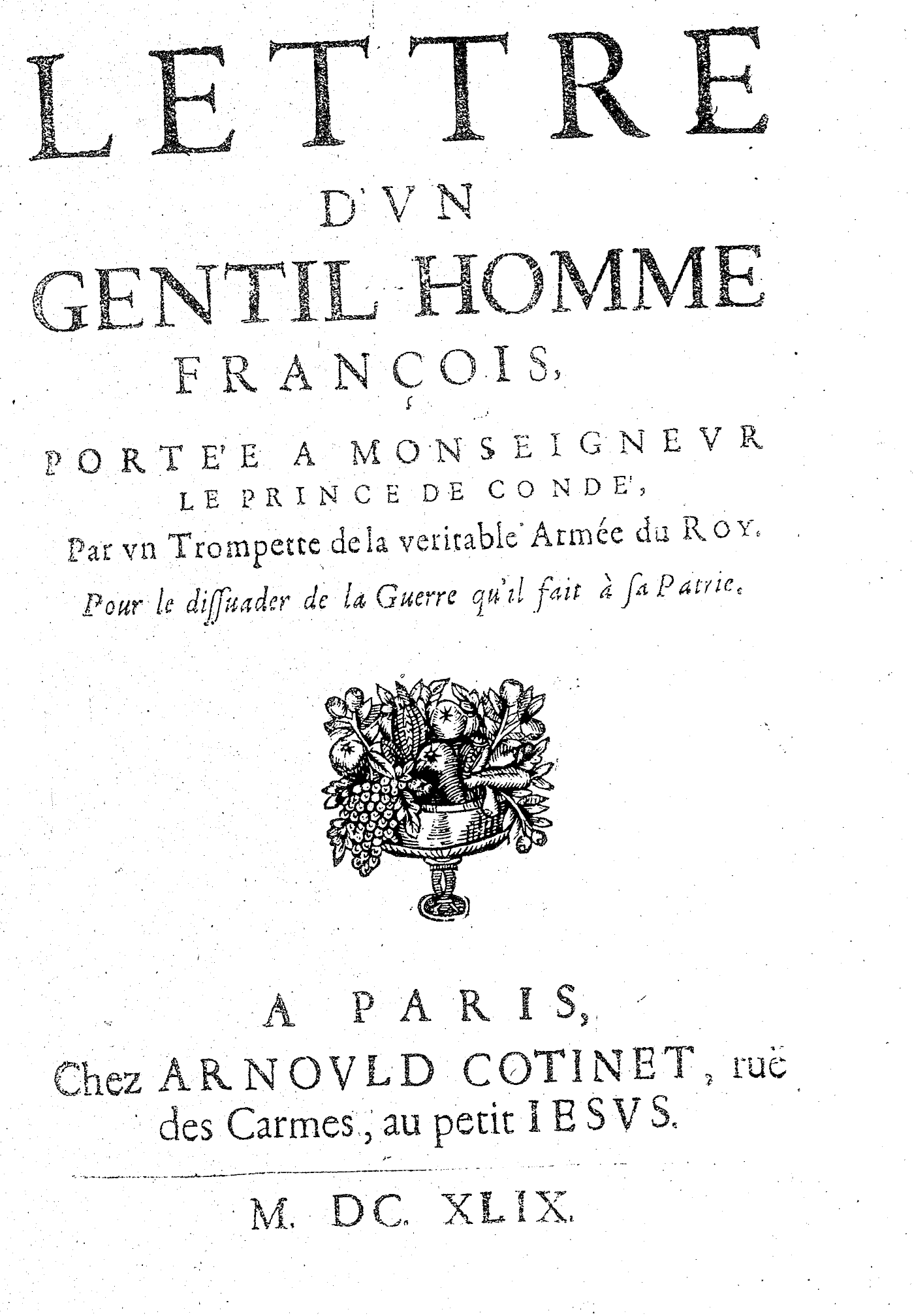 LETTRE D’VN GENTIL-HOMME FRANÇOIS, PORTÉE A MONSEIGNEVR LE PRINCE DE CONDÉ, Par vn Trompette de la veritable Armée du Roy. Pour le dissuader de la Guerre qu’il fait à sa Patrie.