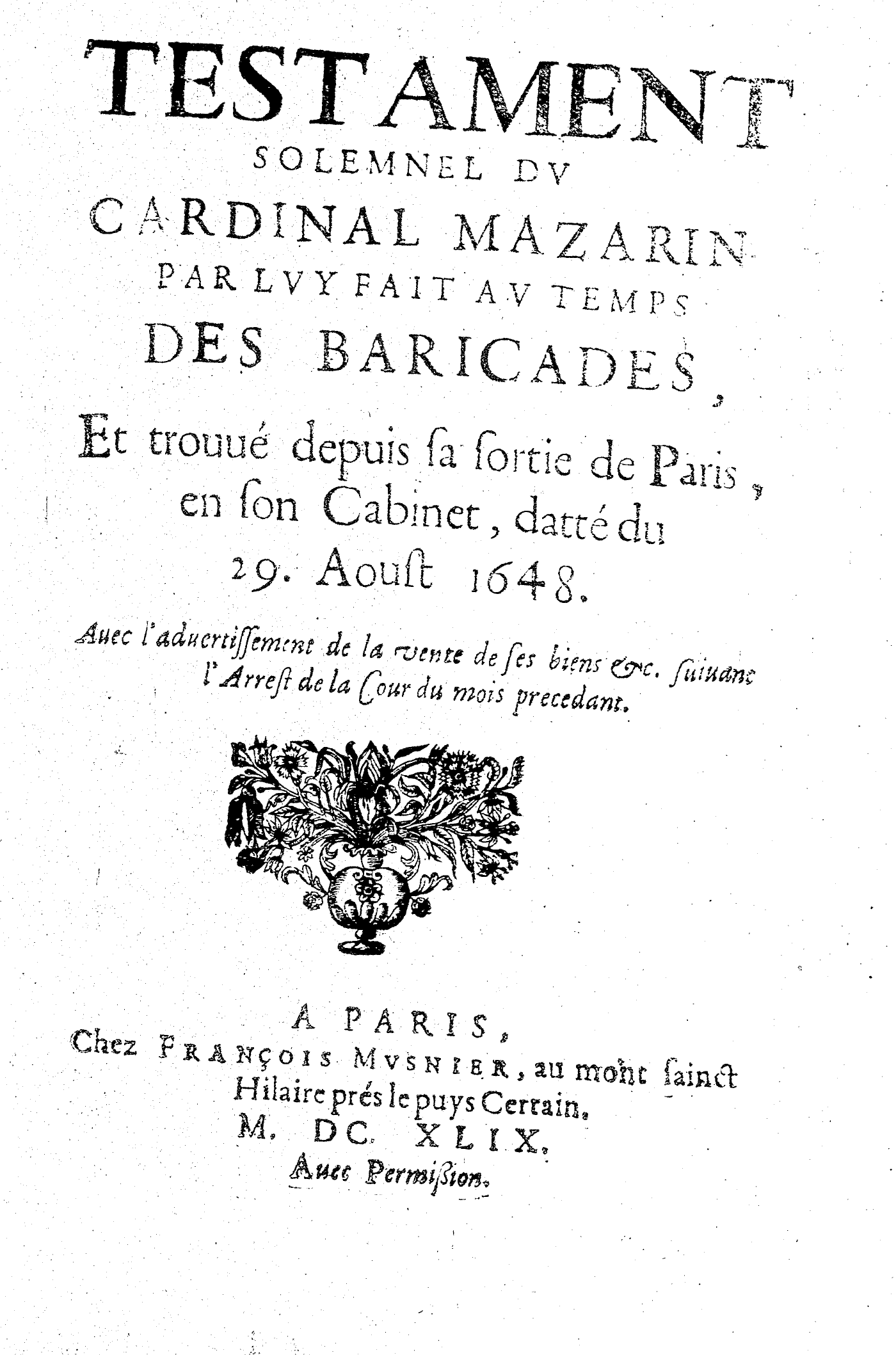 TESTAMENT SOLEMNEL DV CARDINAL MAZARIN PAR LVY FAIT AV TEMPS DES BARICADES, Et trouué depuis sa sortie de Paris, en son Cabinet, datté du 29. Aoust 1648. Auec l’aduertissement de la vente de ses biens &c. suiuant l’Arrest de la Cour du mois precedant.