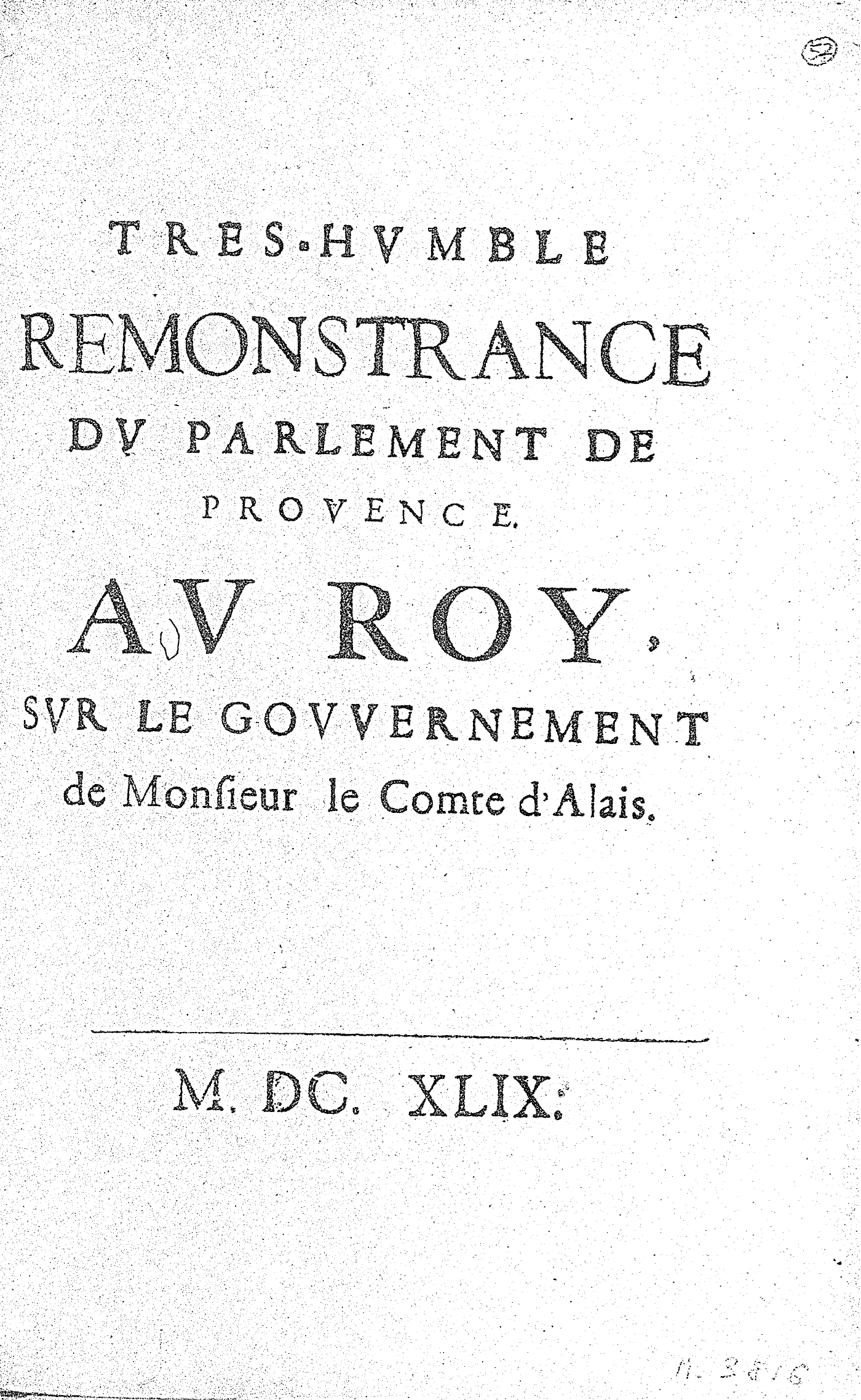 TRES-HVMBLE REMONSTRANCE DV PARLEMENT DE PROVENCE. AV ROY, SVR LE GOVVERNEMENT de Monsieur le Comte d’Alais.
