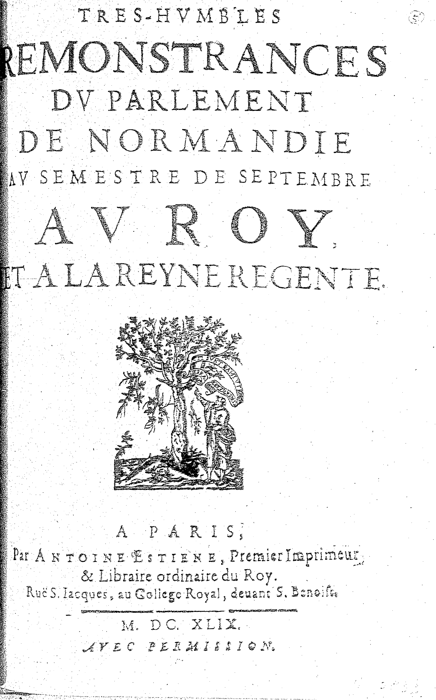 TRES-HVMBLES REMONSTRANCES DV PARLEMENT DE NORMANDIE AV SEMESTRE DE SEPTEMBRE AV ROY, ET A LA REINE REGENTE.