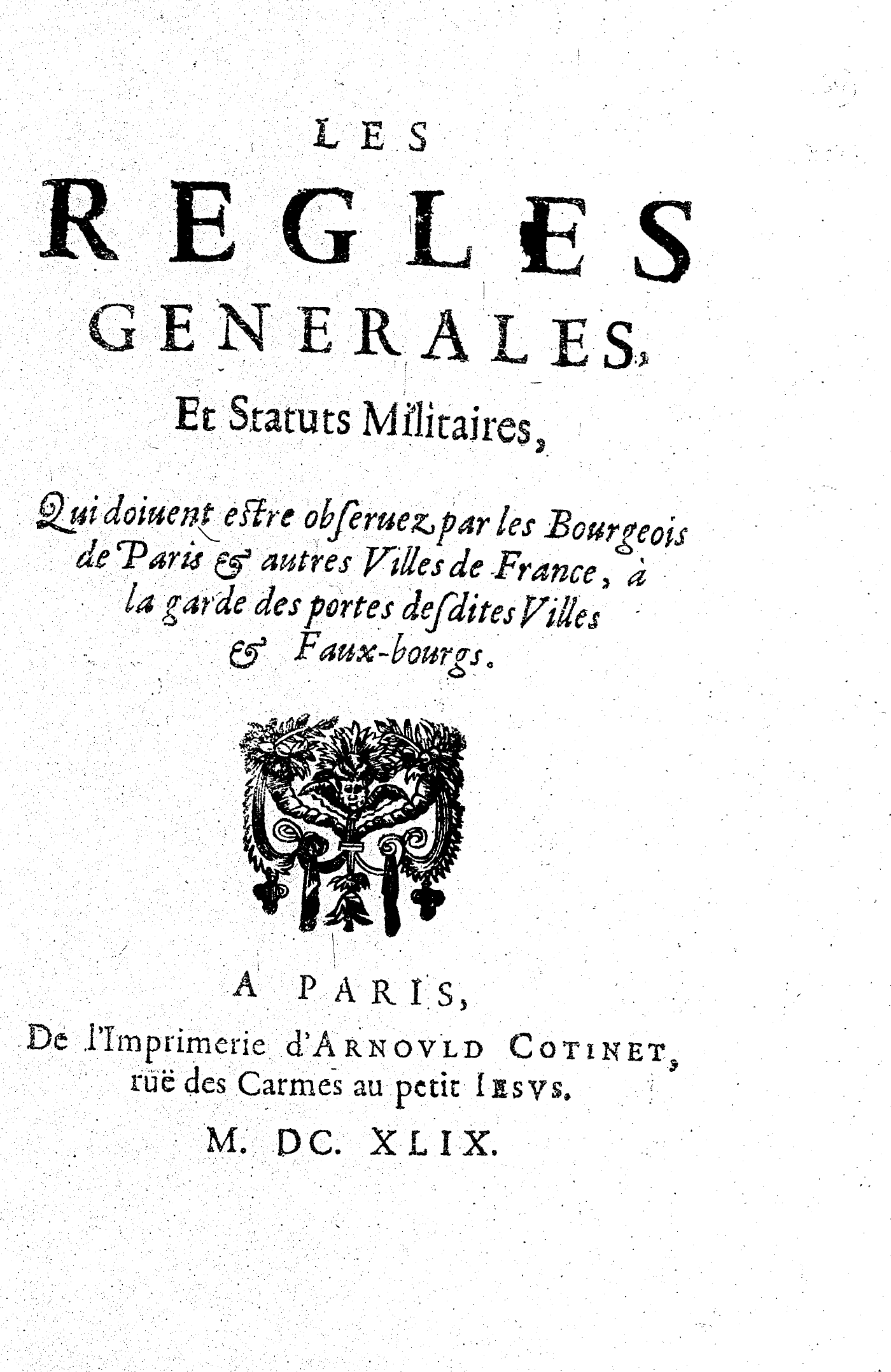 LES REGLES GENERALES, Et Statuts Militaires, Qui doiuent estre obseruez par les Bourgeois de Paris & autres Villes de France, à la garde des portes desdites Villes & Faux-bourgs.