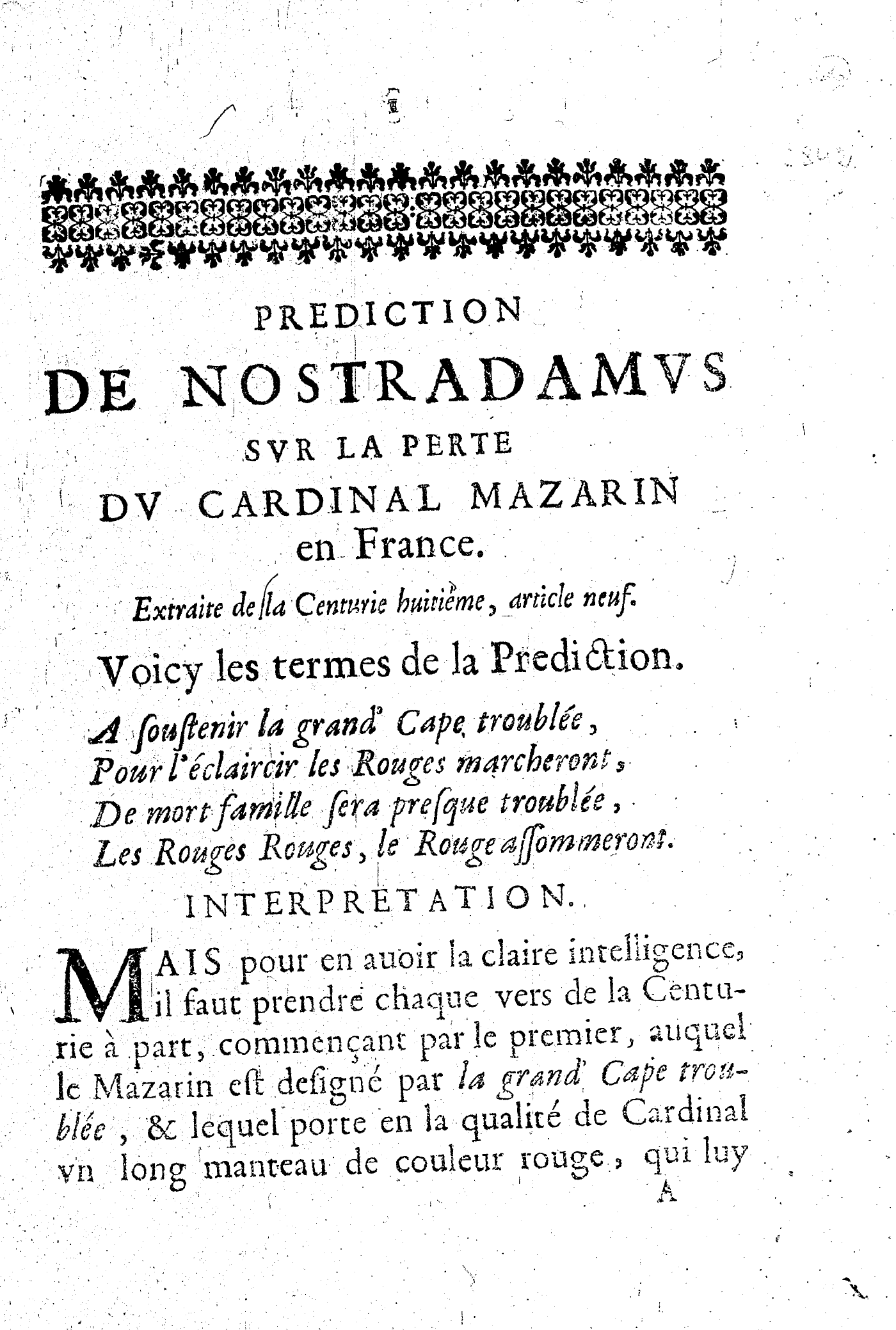 PREDICTION DE NOSTRADAMVS SVR LA PERTE DV CARDINAL MAZARIN en France. Extraite de la Centurie huitiéme, article neuf.