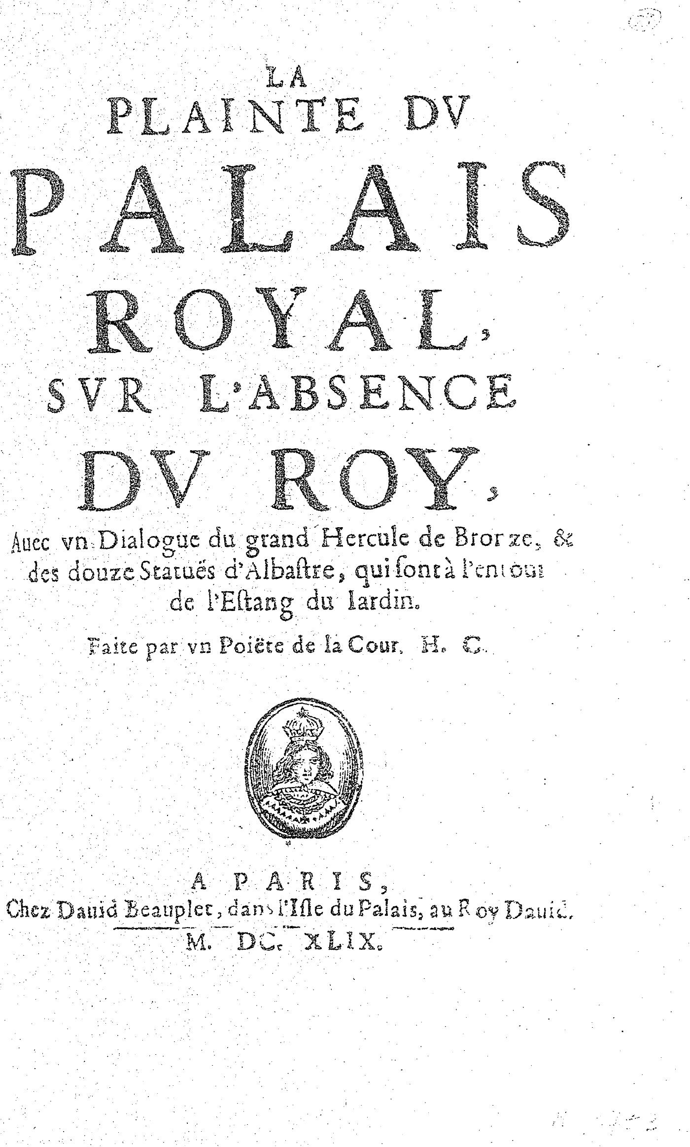 LA PLAINTE DV PALAIS ROYAL, SVR L’ABSENCE DV ROY, Auec vn Dialogue du grand Hercule de Bronze, & des douze Statuës d’Albastre, qui sont à l’entour de l’Estang du Iardin. Faite par vn Poiëte de la Cour. H. C.