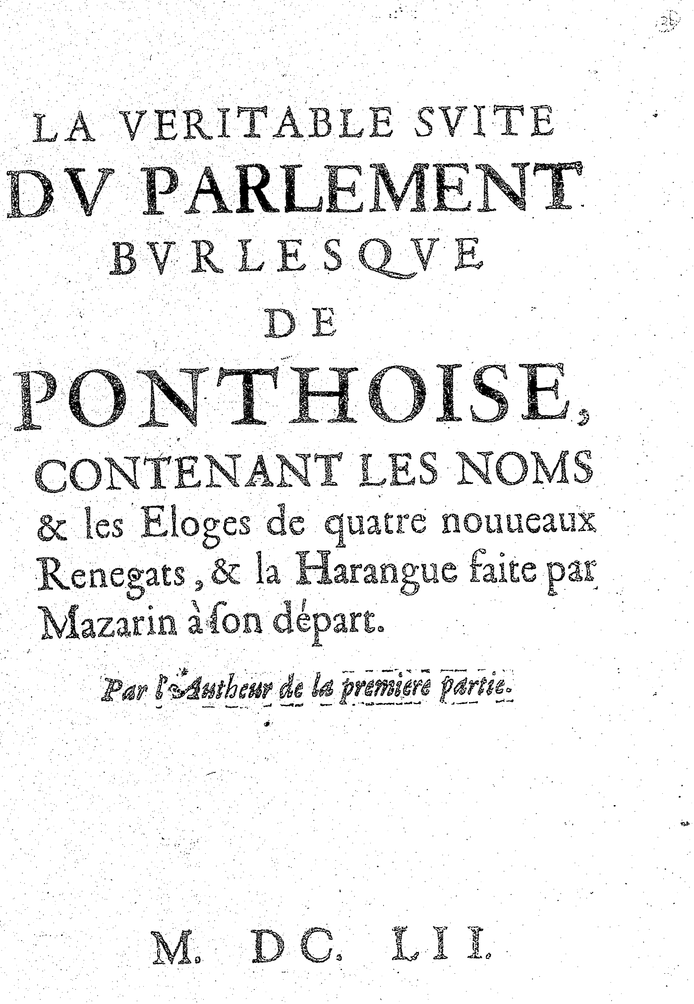 LA VERITABLE SVITE DV PARLEMENT BVRLESQVE DE PONTHOISE, CONTENANT LES NOMS & les Eloges de quatre nouueaux Renegats, & la Harangue faite par Mazarin à son départ. Par l’Autheur de la premiere partie.