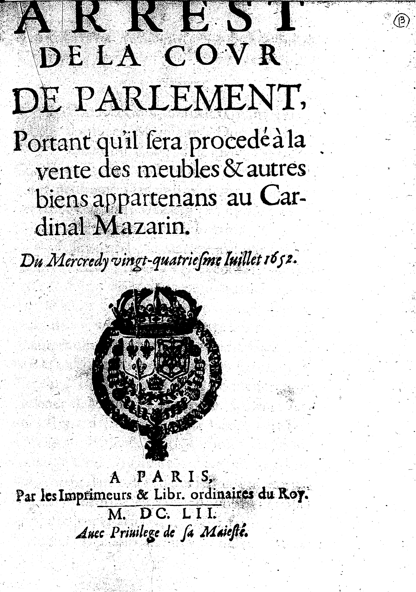 ARREST DE LA COVR DE PARLEMENT, Portant qu’il sera procedé à la vente des meubles & autres biens appartenans au Cardinal Mazarin.