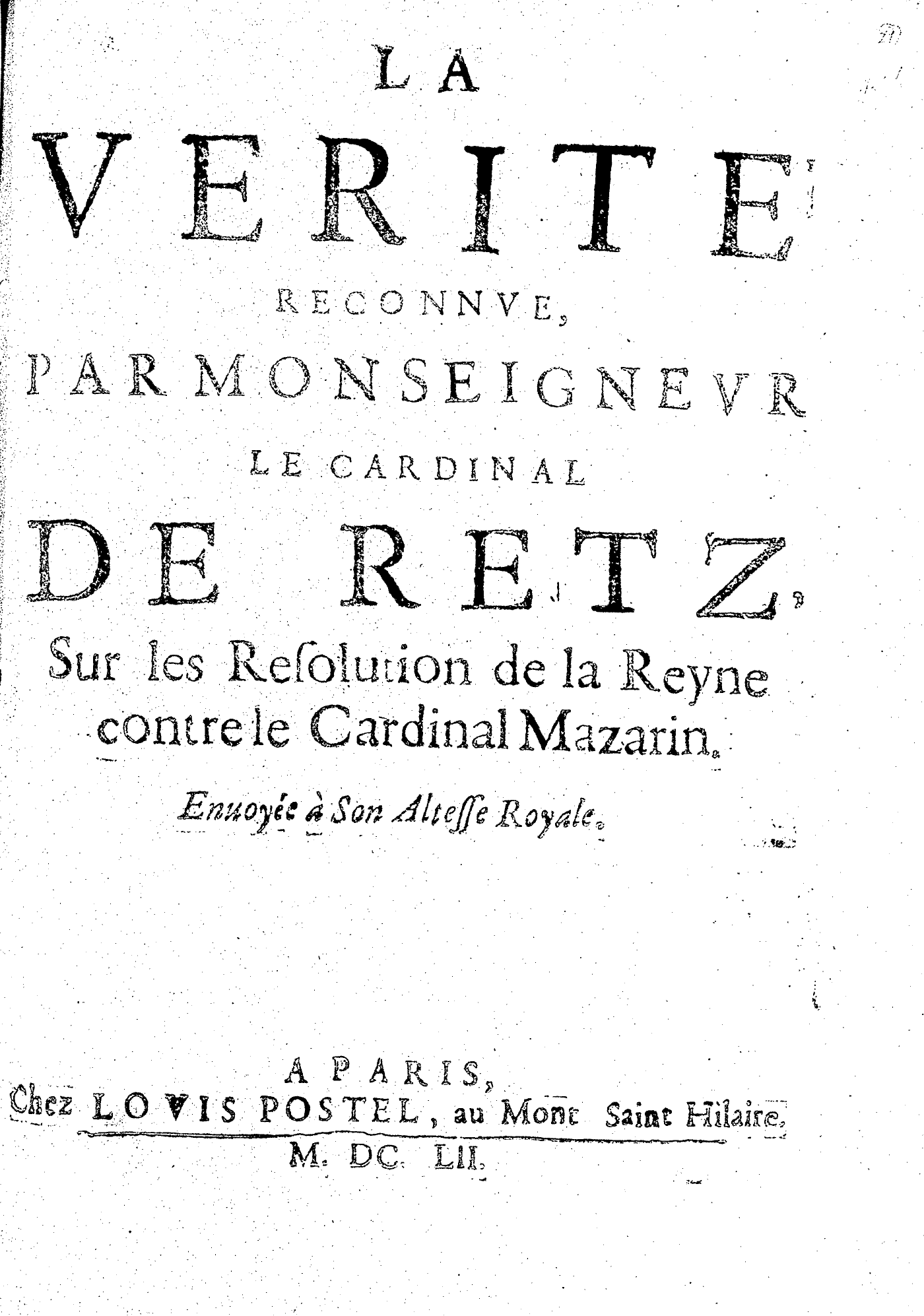 LA VERITÉ RECONNVE, PAR MONSEIGNEVR LE CARDINAL DE RETZ, Sur les Resolution de la Reyne contre le Cardinal Mazarin. Enuoyée à Son Altesse Royale.