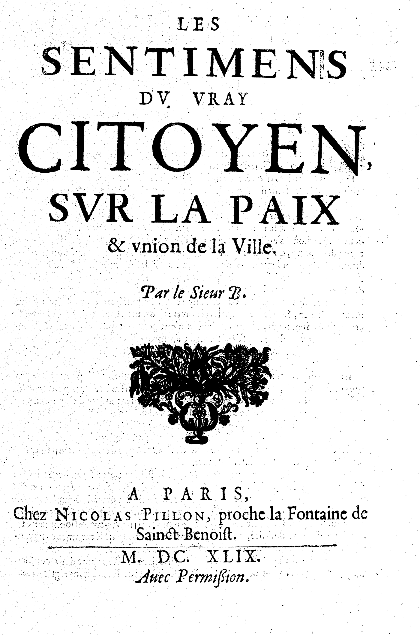 LES SENTIMENS DV VRAY CITOYEN, SVR LA PAIX & vnion de la Ville. Par le Sieur B.
