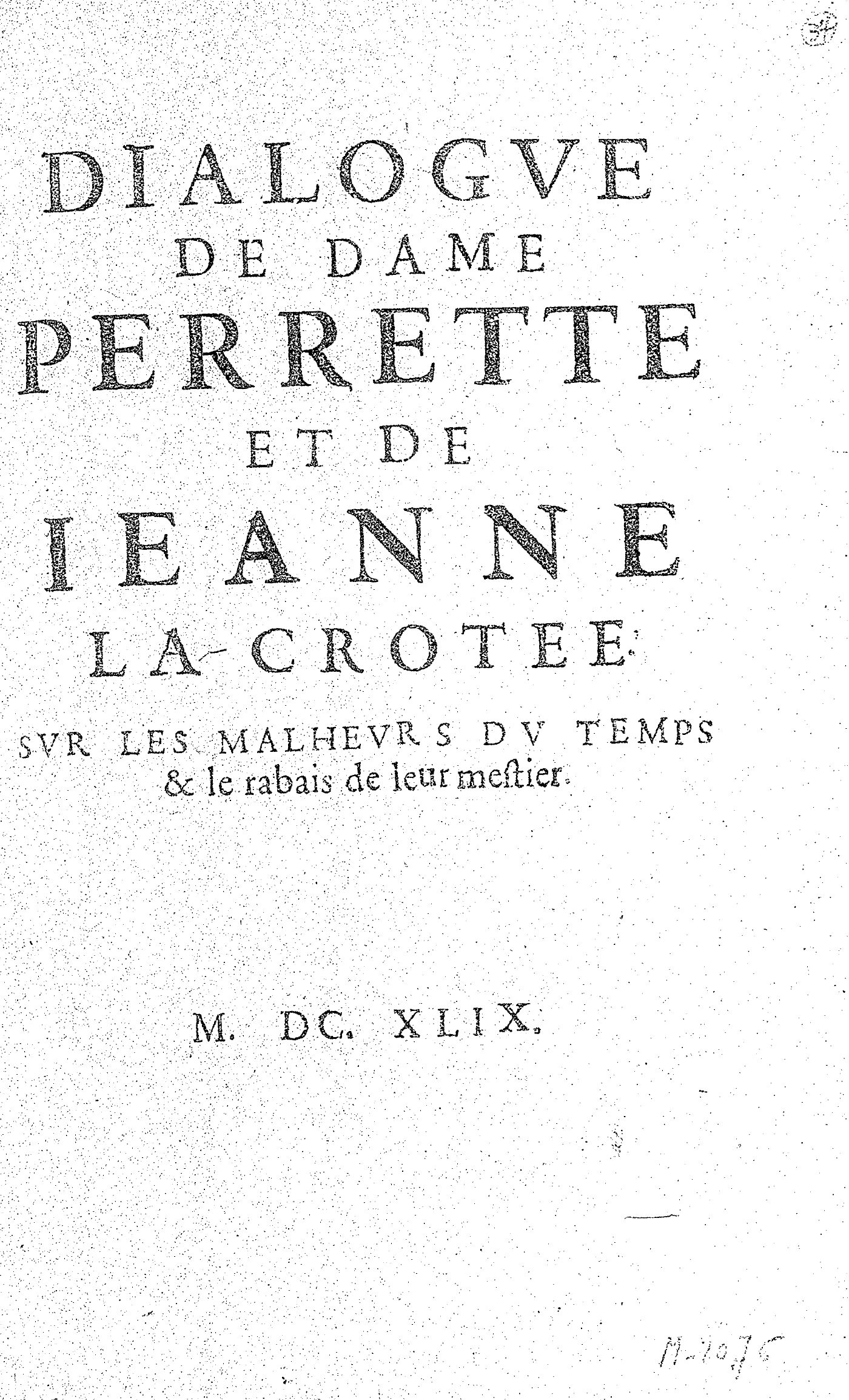 DIALOGVE DE DAME PERRETTE ET DE IEANNE LA CROTEE. SVR LES MALHEVRS DV TEMPS & le rabais de leur mestier.