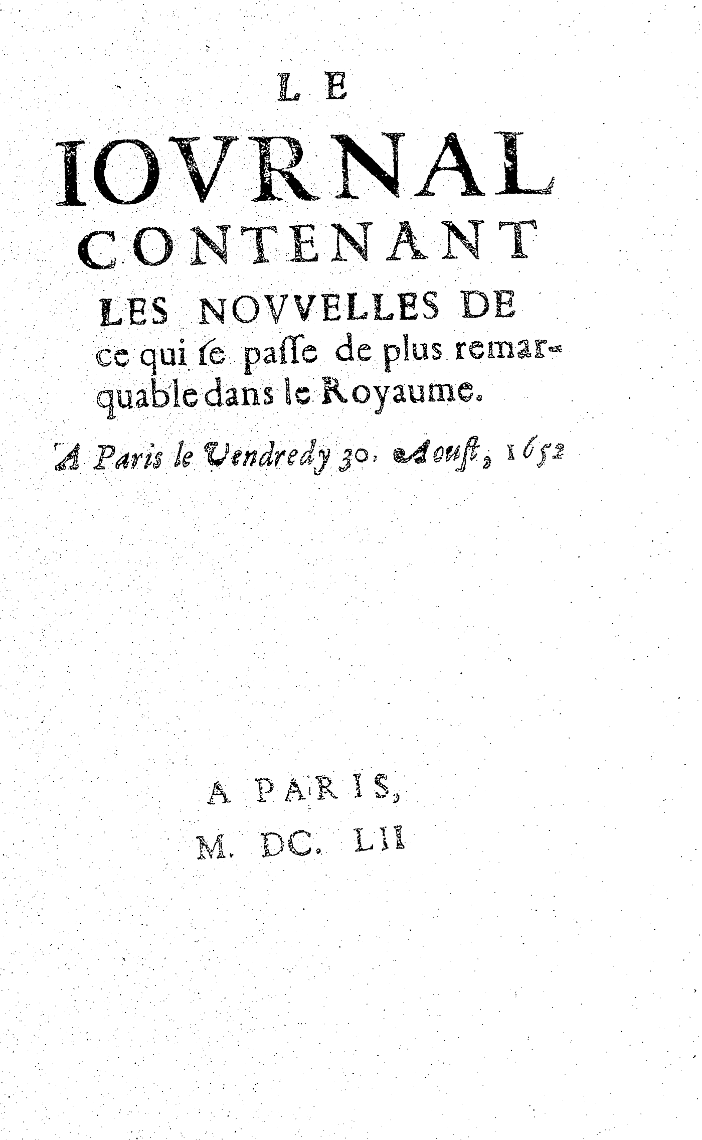 LE IOVRNAL CONTENANT LES NOVVELLES DE ce qui se passe de plus remarquable dans le Royaume. A Paris le Vendredy 30. Aoust, 1652