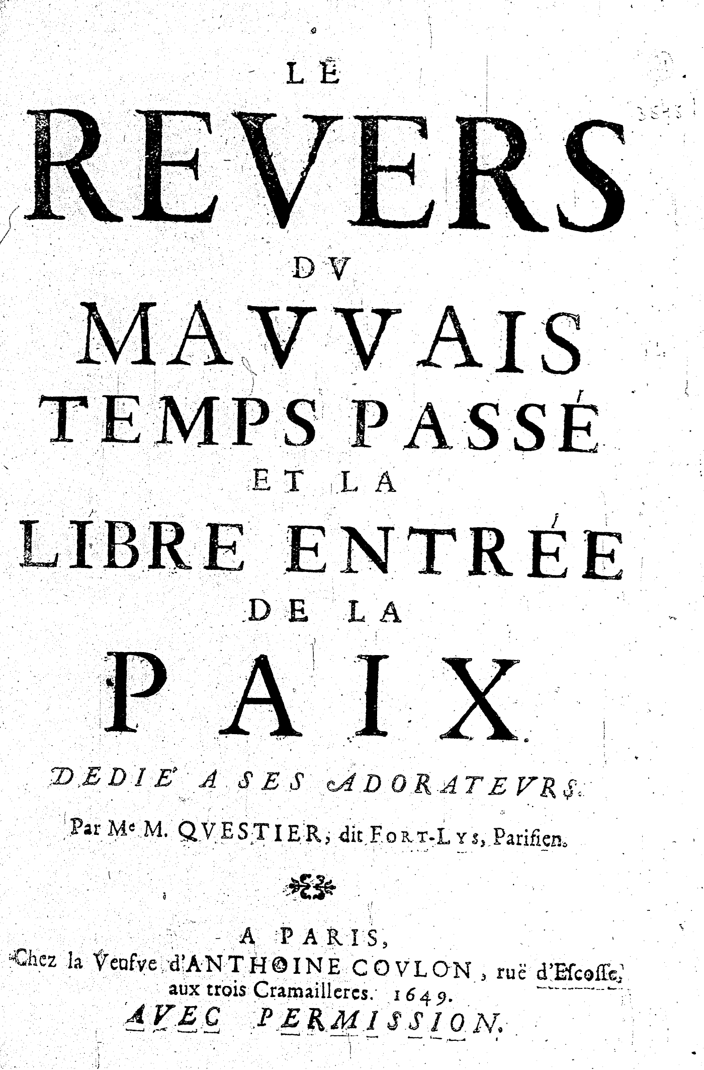 LE REVERS DV MAVVAIS TEMPS PASSÉ ET LA LIBRE ENTRÉE DE LA PAIX. DEDIÉ A SES ADORATEVRS. Par Me M. QVESTIER, dit FORT-LYS, Parisien.