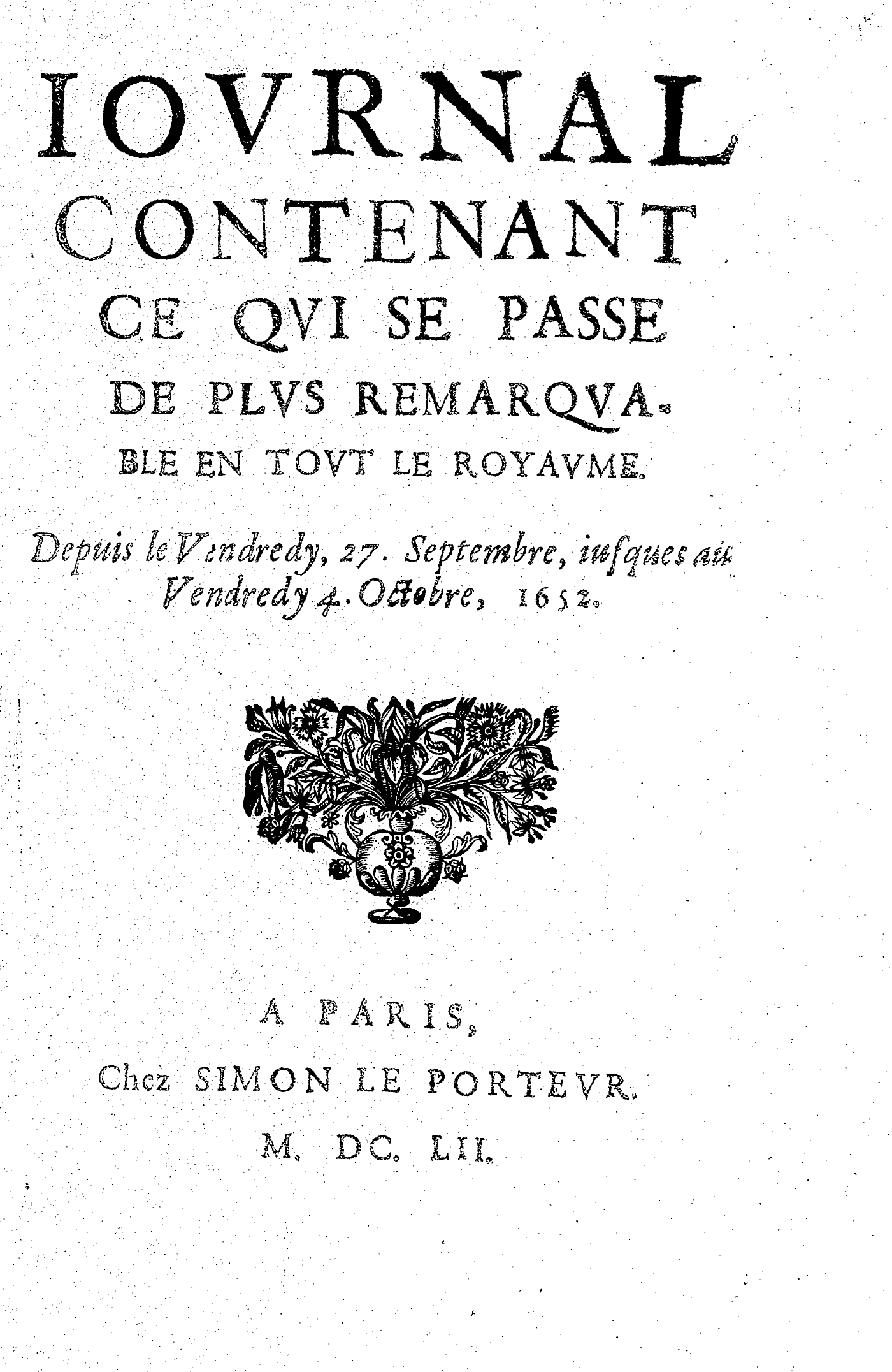 Notice Moreau : Douze pièces. La dernière porte la date des 25-31 octobre. Le titre n'est pas absolument le même pour toutes. Ceux de la deuxième et de la troisième commencent ainsi : "Journal contenant les nouvelles de ce qui se passe", etc. On lit en tête de la sixième : « Journal de tout ce qui s'est passé par tout le royaume de France, ensemble ce qui s'est passé dans le conseil du roi et de messieurs les princes et du Parlement. » Celle-ci a été publiée par Simon de la Montagne. A partir de la quatrième, toutes les autres ont paru chez Simon le Porteur. Ce journal est très-rare ; et à cause de cela, j'en extrairai quelques anecdotes. Les bourgeois de Paris étaient allés en corps au Luxembourg se plaindre des vols et des violences de l'armée des princes. Le duc de Beaufort les en réprimanda. « Monseigneur, répliqua l'un d'eux, quand nous nous sommes assemblés encore en plus grand nombre pour votre salut, on ne nous a pas fait ces reproches. » Il y eut plus tard des luttes entre les bourgeois et les soldats. La cause première en fut qu'un soldat du duc de Wurtemberg, passant dans le faubourg Saint-Denis avec un détachement, vola une botte de foin sur une charrette. Le 14 septembre, le cardinal de Retz, revenant de Compiègne, fut sifflé tout le long de la rue de Saint-Denis, et insulté le lendemain par Pesche dans le palais d'Orléans. Ce n'est pas ce que raconte Guy Joly. Le prince de Condé, passant la Seine en bateau, prit de l'eau dans son chapeau et but au duc de Lorraine, en lui disant : "A toi, prince." (6 septembre.) Trois députés des maçons, charpentiers, couvreurs, paveurs, serruriers, tapissiers et autres allèrent demander au duc d'Orléans des passe-ports pour Saint-Germain. Ils furent refusés et maltraités. (5 octobre.) Le comte de Tavannes reçut, après le décampement de Turenne à Villeneuve Saint-Georges, un brevet de maréchal de France. Madame de Bossut se mit à genoux devant le duc de Guise chez Mademoiselle, le suppliant de la reconnaître pour sa femme ; mais le duc traita cela de comédie. Il paraissait le même pour mademoiselle de Pons, malgré le bruit du maréchal d'Aumont. (16 octobre.) Après l'audience des colonels de la milice à Saint-Germain, la reine en railla plusieurs, demandant à l'un où était son écharpe rouge (Espagnole), à l'autre son écharpe jaune (Lorraine), et disant au président Charton : « Ah ! monsieur, que le feu de la Grève étoit beau ! et qu'il en éclaira plusieurs ! » voulant dire qu'il le fit changer d'opinion. Le vendredi 18 octobre, il y eut au Palais-Royal des placards ordonnant aux bourgeois de porter du bleu et du blanc. Le bleu était la couleur du roi, et le blanc celle de la nation. On trouve le premier numéro de ce journal avec le titre qui suit : "Recueil du Journal contenant ce qui se passe de plus remarquable en tout le royaume, depuis le vendredi 23 août jusqu'au vendredi 23 septembre 1652". C'est apparemment le titre d'une réimpression des quatre premiers numéros ; car on a pu remarquer que le journal paraissait tous les vendredis.