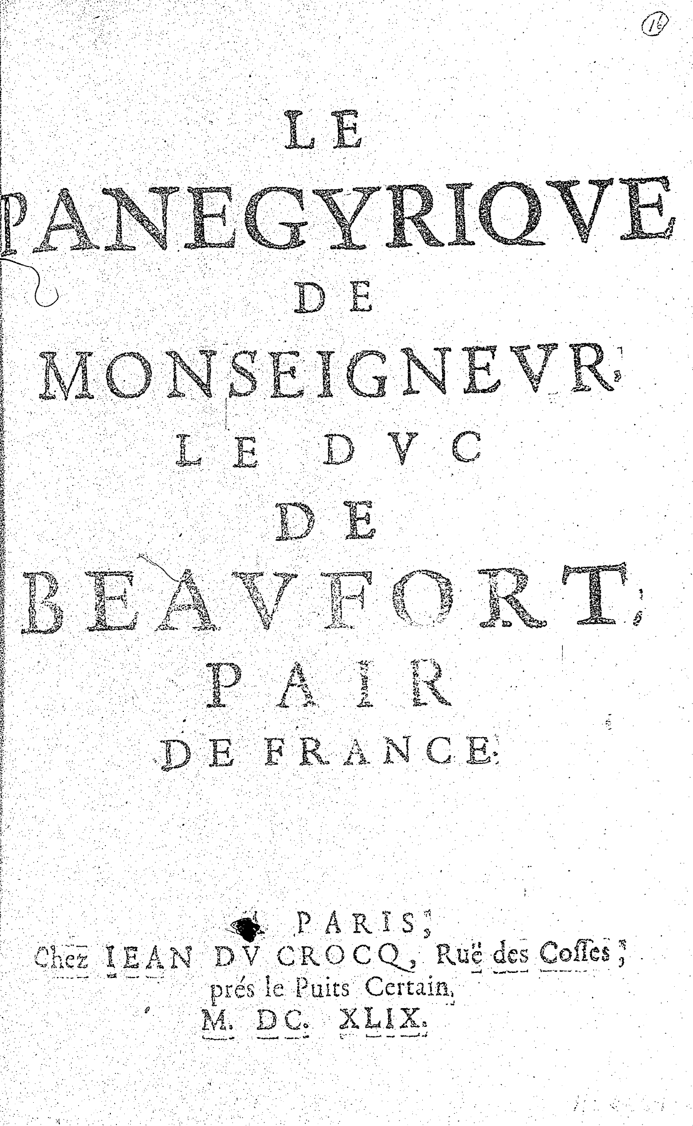 LE PANEGYRIQVE DE MONSEIGNEVR, LE DVC DE BEAVFORT, PAIR DE FRANCE.