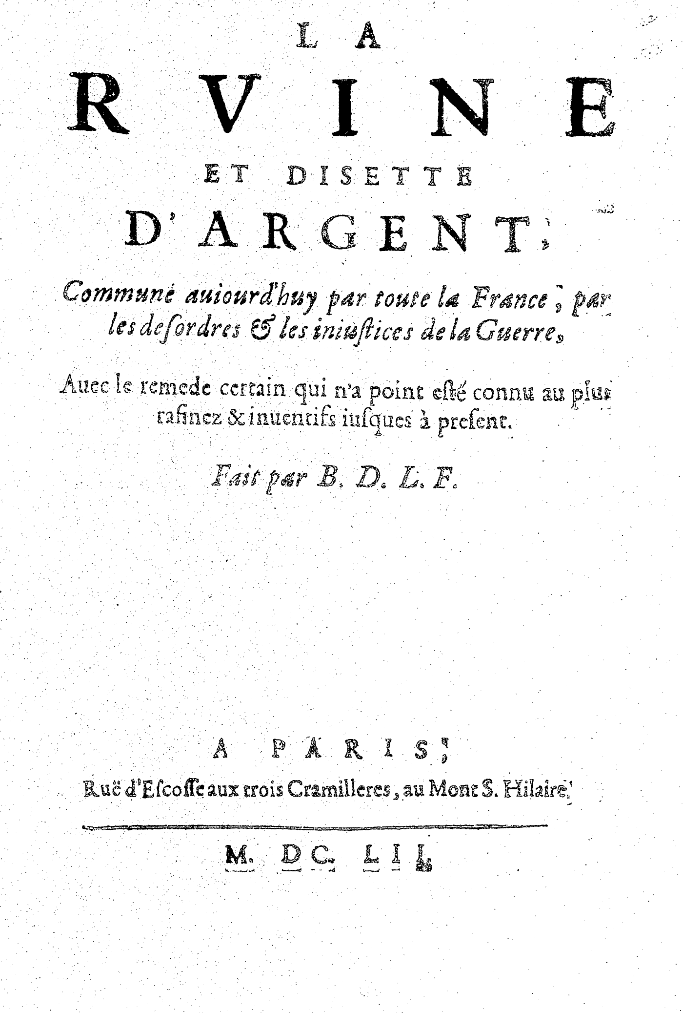 LA RVINE ET DISETTE D’ARGENT, Commune auiourd’huy par toute la France, par les desordres & les iniustices de la Guerre, Auec le remede certain qui n’a point esté connu au plut rafinez & inuentifs iusques à present. Fait par B. D. L. F.