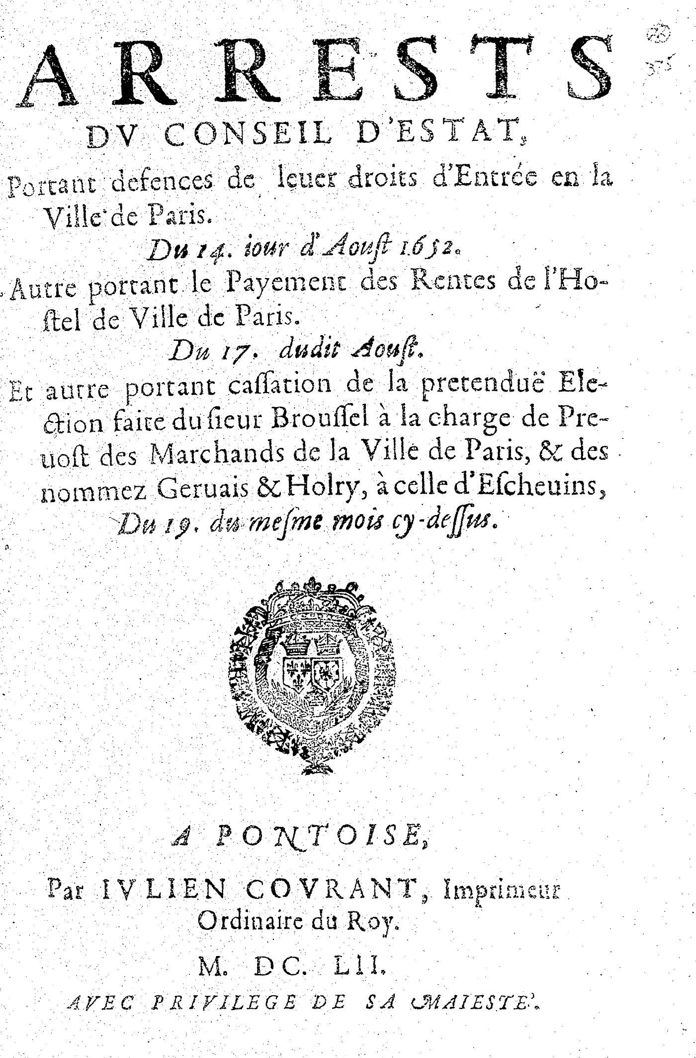 ARRESTS DV CONSEIL D’ESTAT, Portant defences de leuer droits d’entrée en la Ville de Paris. Du 14. iour d’Aoust 1652. Autre portant le Payement des Rentes de l’Hostel de Ville de Paris. Du 17. dudit Aoust. Et autre portant cassation de la pretenduë Election faire du sieur Broussel à la charge de Preoust des Marchands de la Ville de Paris, & des nommez Geruais & Holry, à celle d’Escheuins, Du 19. du mesme mois cy-dessus.