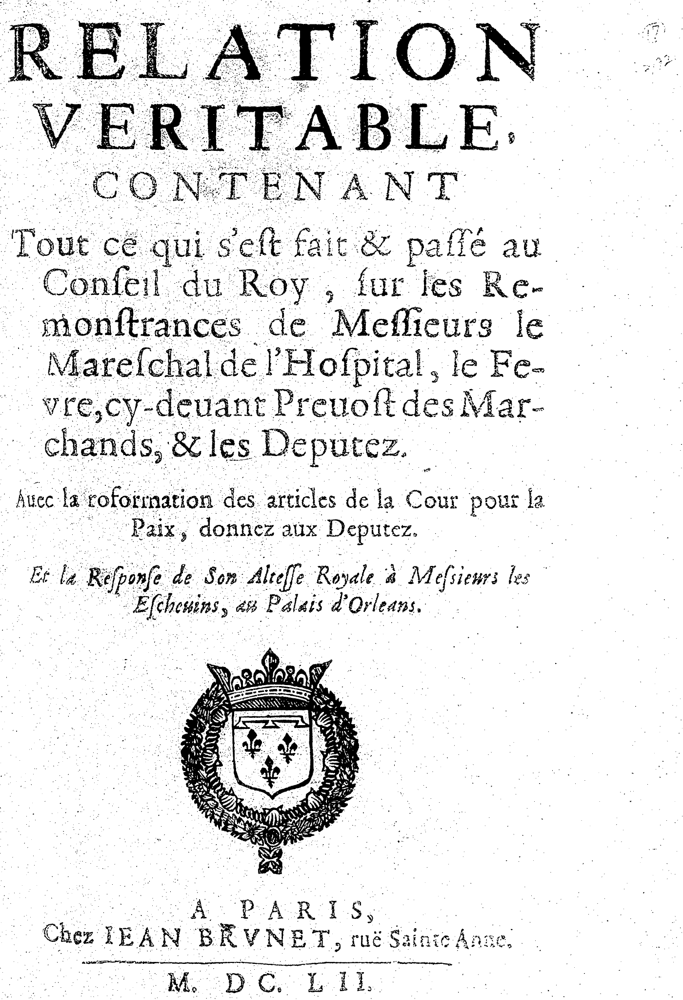 RELATION VERITABLE, CONTENANT Tout ce qui s’est fait & passé au Conseil du Roy, sur les Remonstrances de Messieurs le Mareschal de l’Hospital, le Fevre, cy-deuant Preuost des Marchands, & les Deputez.