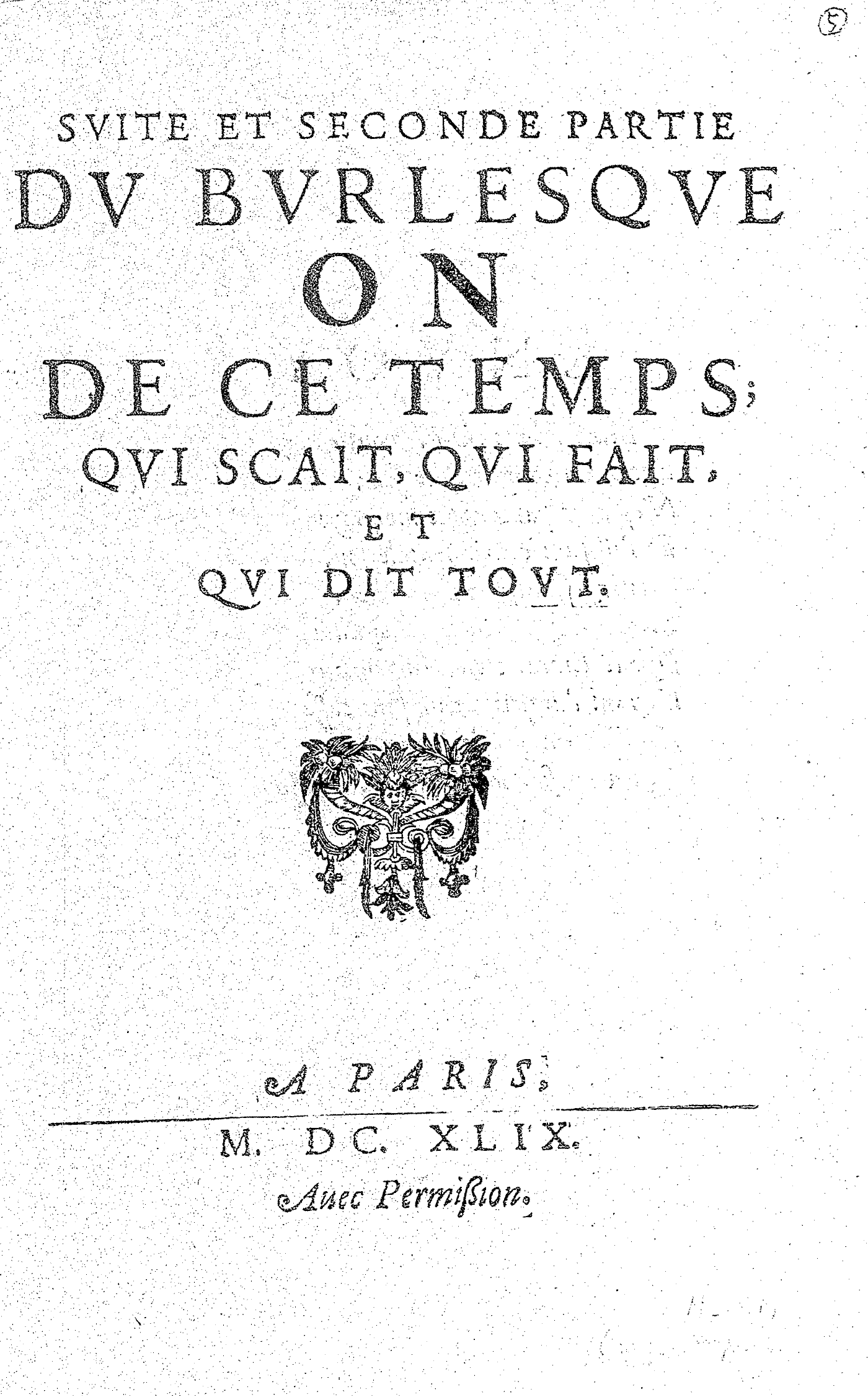 SVITE ET SECONDE PARTIE DV BVRLESQVE ON DE CE TEMPS ; QVI SCAIT, QVI FAIT, ET QVI DIT TOVT.