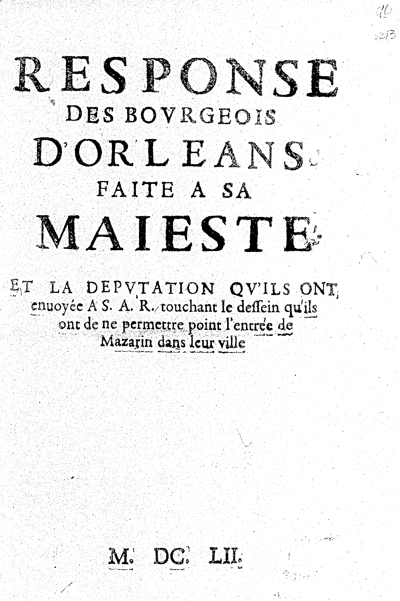 RESPONSE DES BOVRGEOIS D’ORLEANS FAITE A SA MAIESTÉ. ET LA DEPVTATION QV’ILS ONT enuoyée A. S. A. R. touchant le dessein qu’ils ont de ne permettre point l’entrée de Mazarin dans leur ville