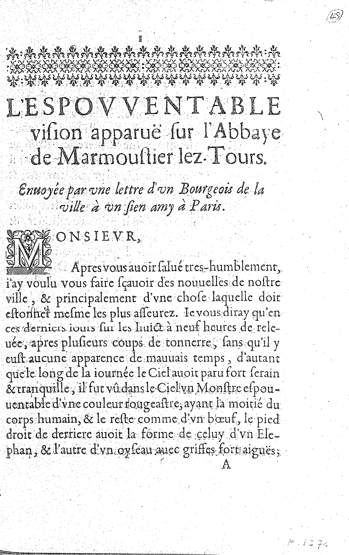 L’ESPOVVENTABLE vision apparuë sur l’Abbaye de Marmoustier lez-Tours. Enuoyée par vne lettre d’vn Bourgeois de la ville à vn sien amy à Paris.