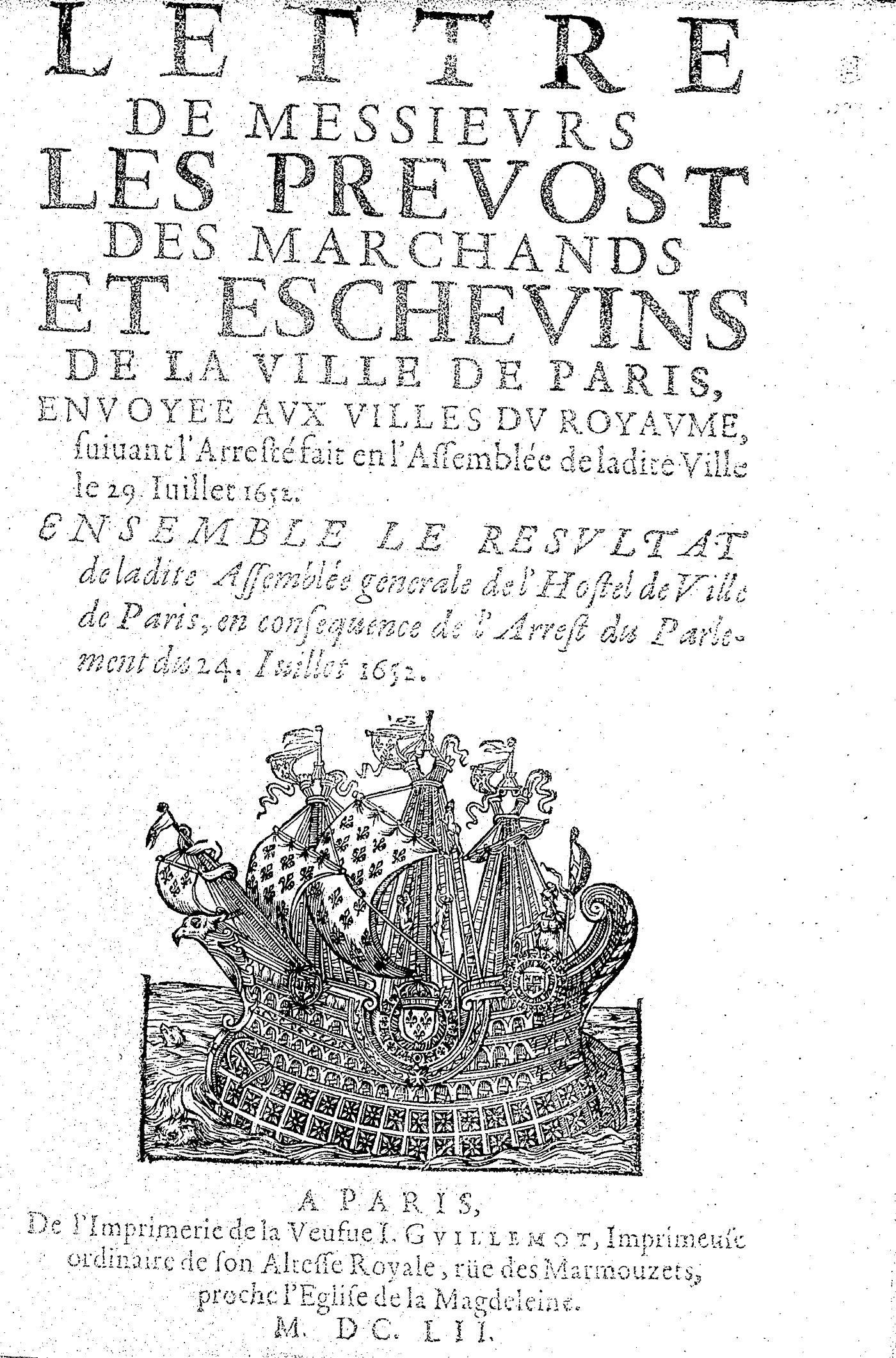 LETTRE DE MESSIEVRS LES PREVOST DES MARCHANDS ET ESCHEVINS DE LA VILLE DE PARIS, ENVOYÉE AVX VILLES DV ROYAVME, suiuant l’Arresté fait en l’Assemblée de ladite Ville le 29. Iuillet 1652. ENSEMBLE LE RESVLTAT de ladite Assemblée generale de l’Hostel de Ville de Paris, en consequence de l’Arrest du Parlement du 24. Iuillet 1652.
