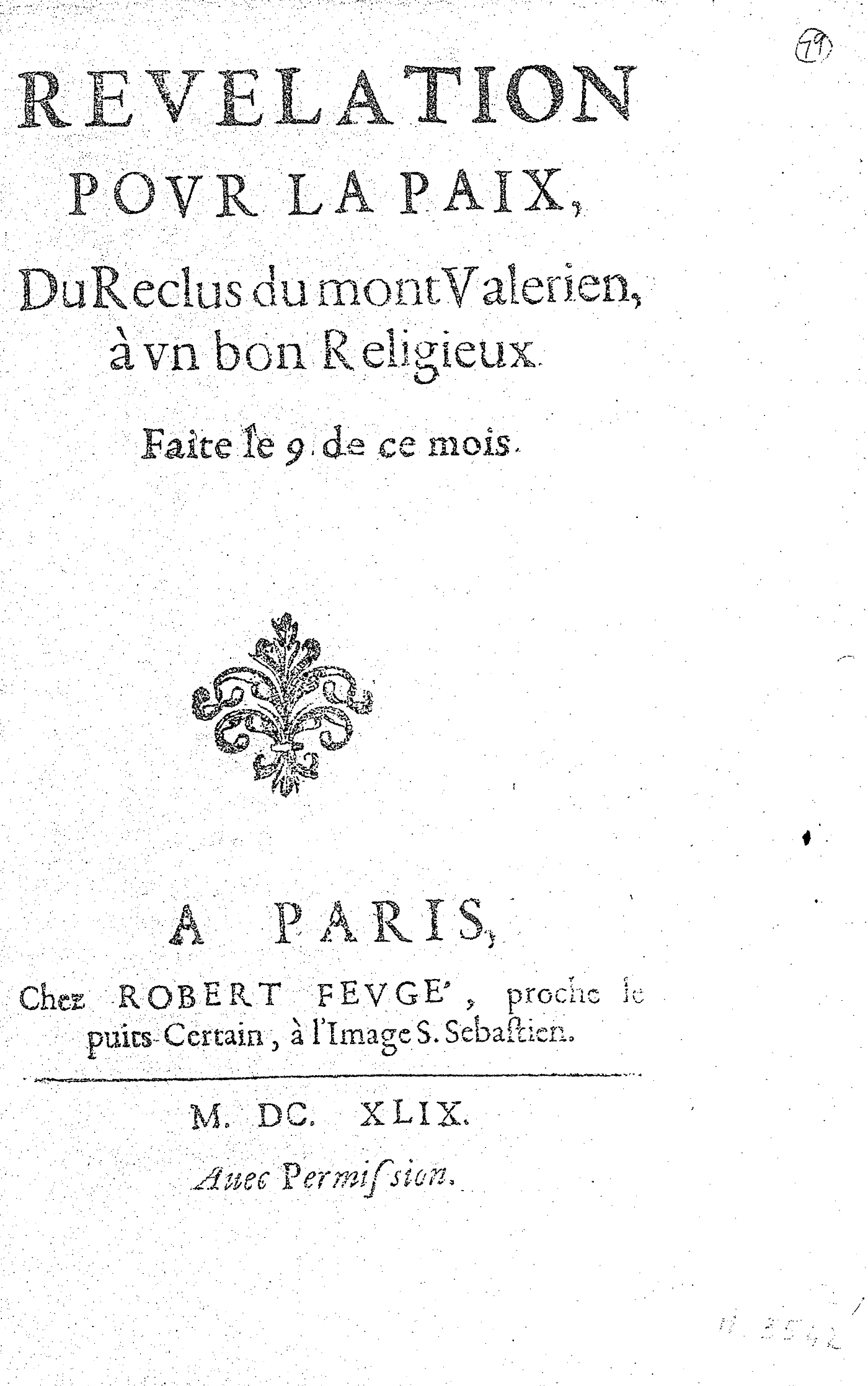 REVELATION POVR LA PAIX, Du Reclus du mont Valerien, à vn bon Religieux. Faite le 9 de ce mois.