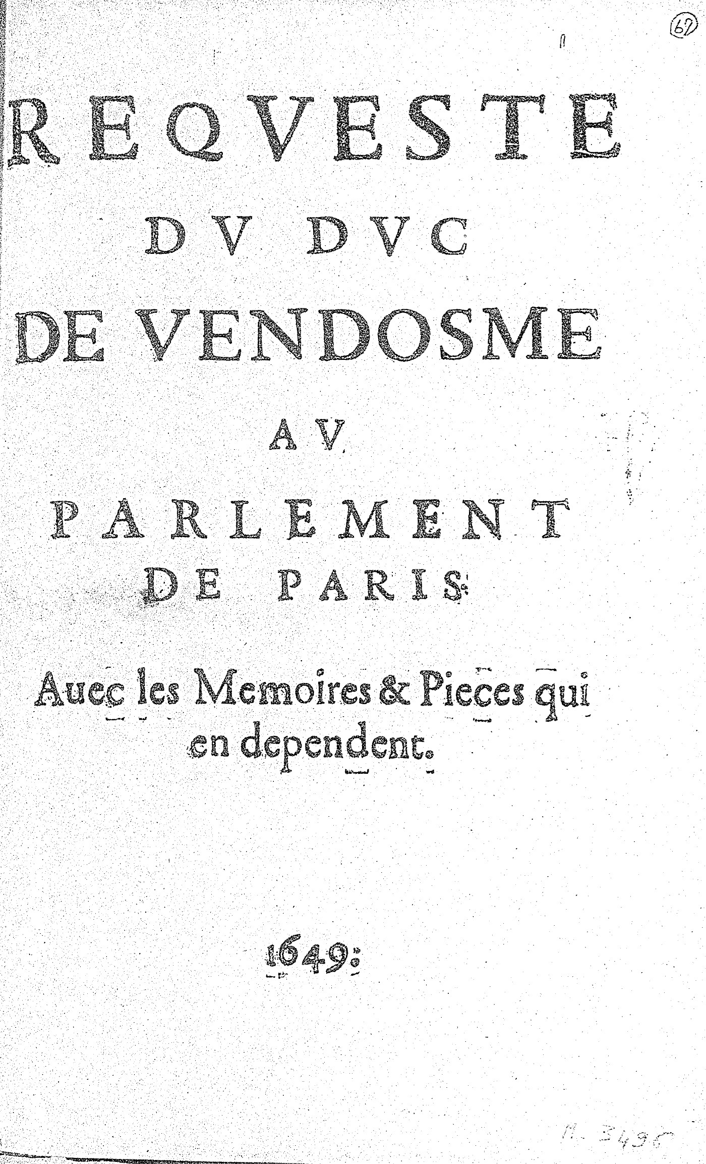 REQVESTE DV DVC DE VENDOSME AV PARLEMENT DE PARIS. Auec les Memoires & Pieces qui en dependent.