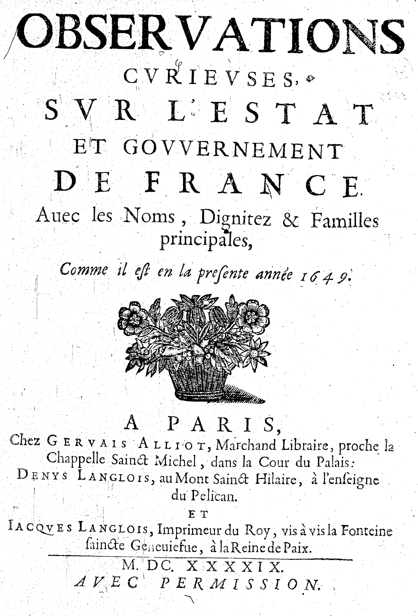 OBSERVATIONS CVRIEVSES, SVR L’ESTAT ET GOVVERNEMENT DE FRANCE. Auec les Noms, Dignitez & Familles principales, Comme il est en la presente année 1649.