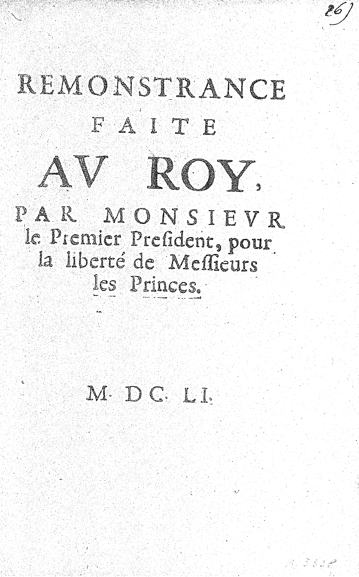 REMONSTRANCE FAITE AV ROY, PAR MONSIEVR le Premier President, pour la liberté de Messieurs les Princes.