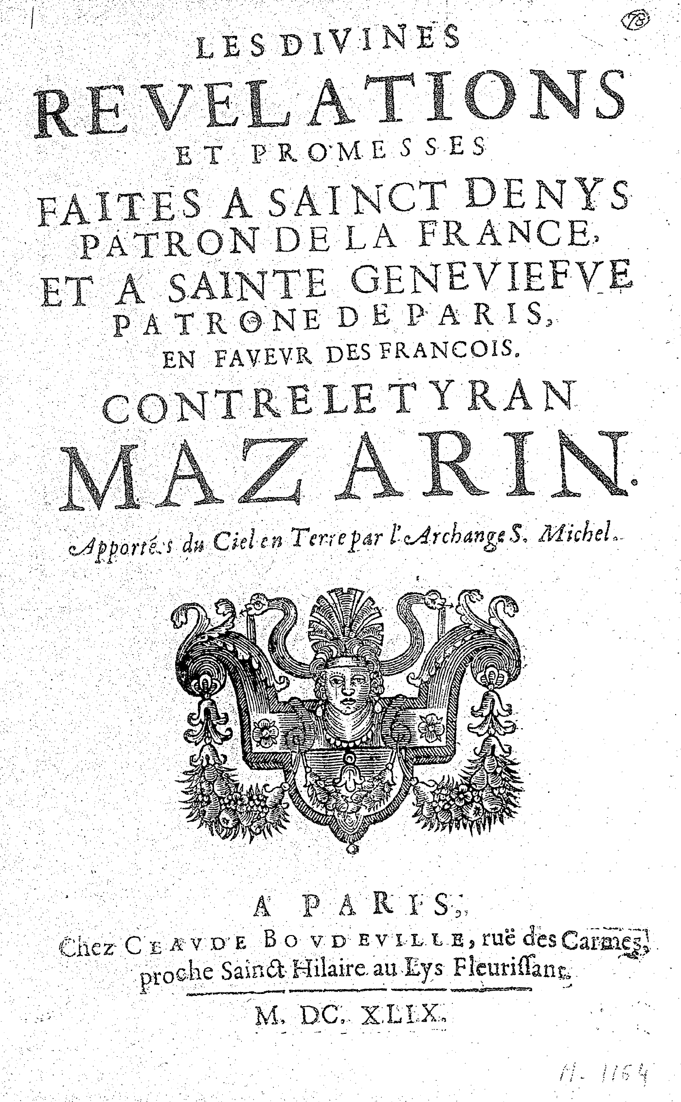 LES DIVINES REVELATIONS ET PROMESSES FAITES A SAINCT DENYS PATRON DE LA FRANCE, ET A SAINTE GENEVIEFVE PATRONE DE PARIS, EN FAVEVR DES FRANCOIS. CONTRE LE TYRAN MAZARIN. Apportées du Ciel en Terre par l’Archange S. Michel.
