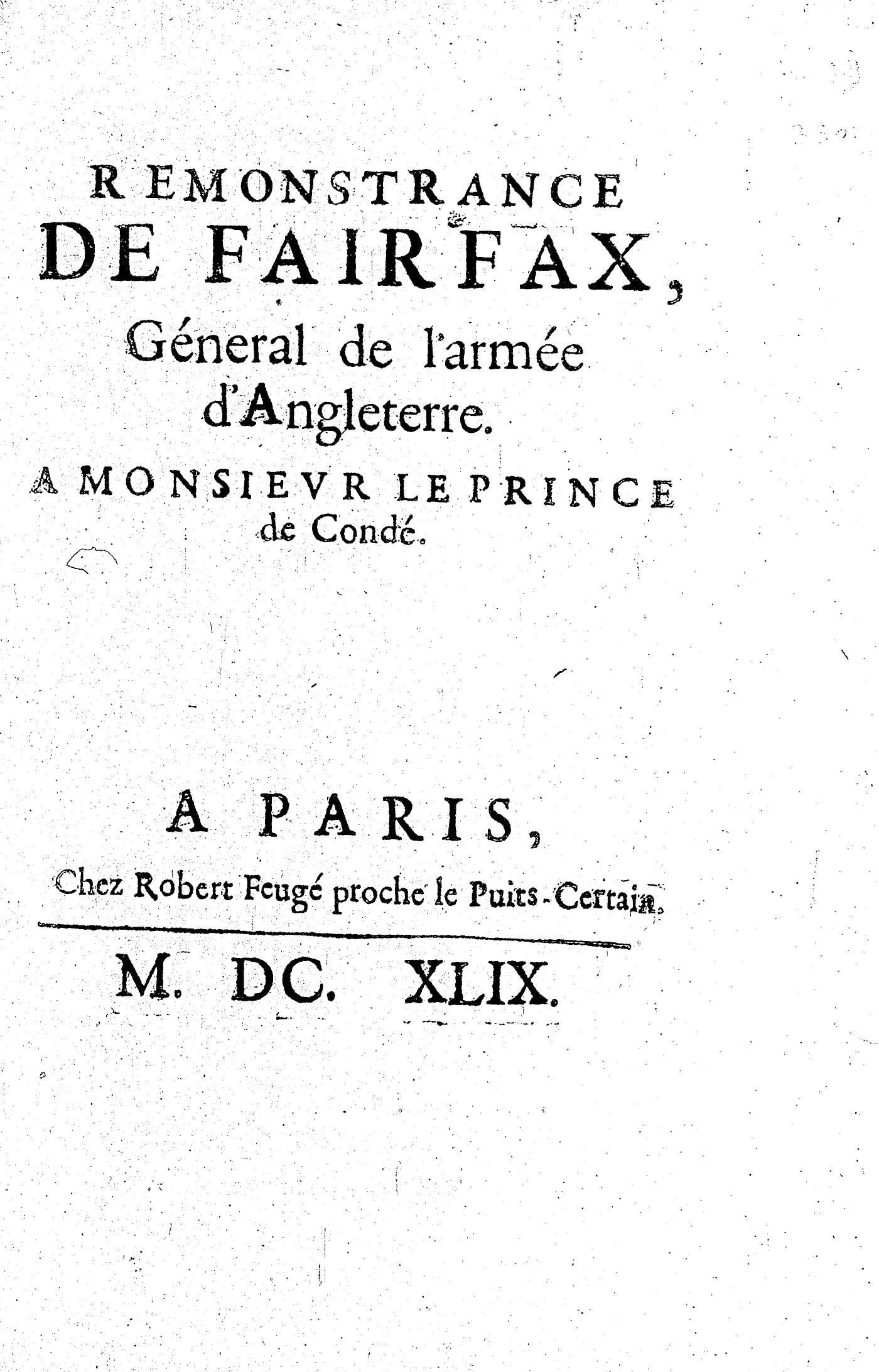 REMONSTRANCE DE FAIRFAX, Géneral de l’armée d’Angleterre. A MONSIEVR LE PRINCE de Condé.