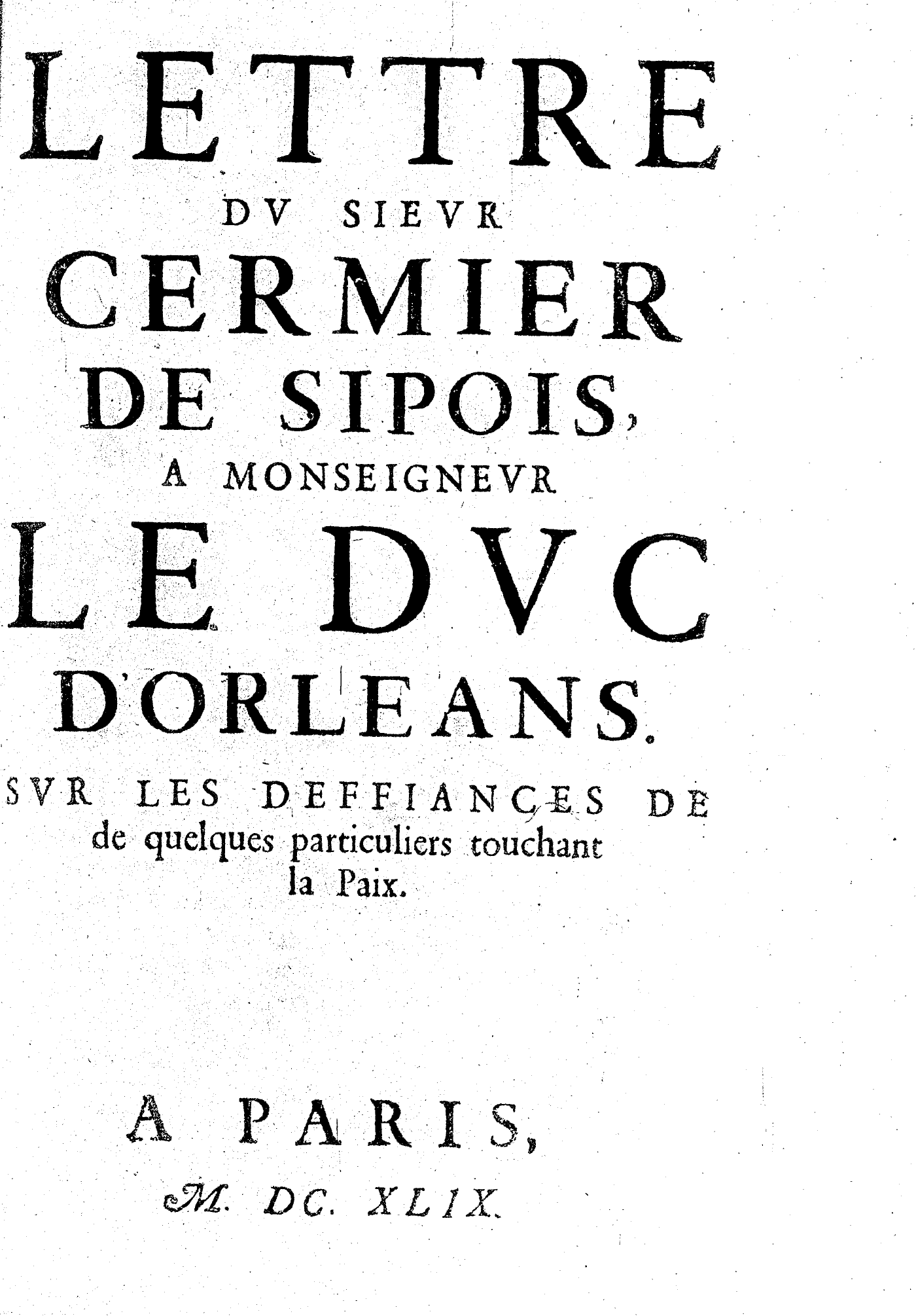 LETTRE DV SIEVR CERMIER DE SIPOIS, A MONSEIGNEVR LE DVC D’ORLEANS. SVR LES DEFFIANCES DE de quelques particuliers touchant la Paix.