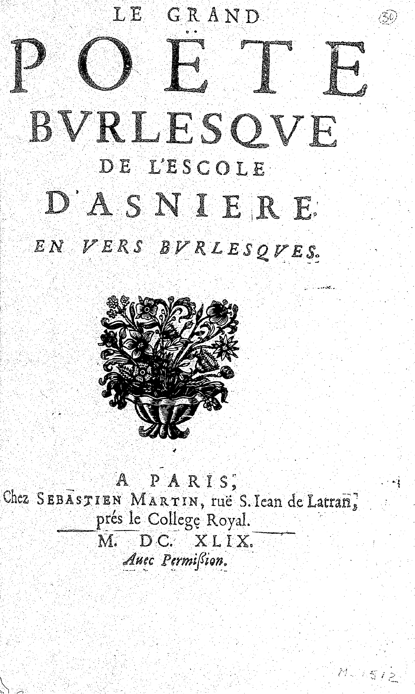 LE GRAND POËTE BVRLESQVE DE L’ESCOLE D’ASNIERE. EN VERS BVRLESQVES.