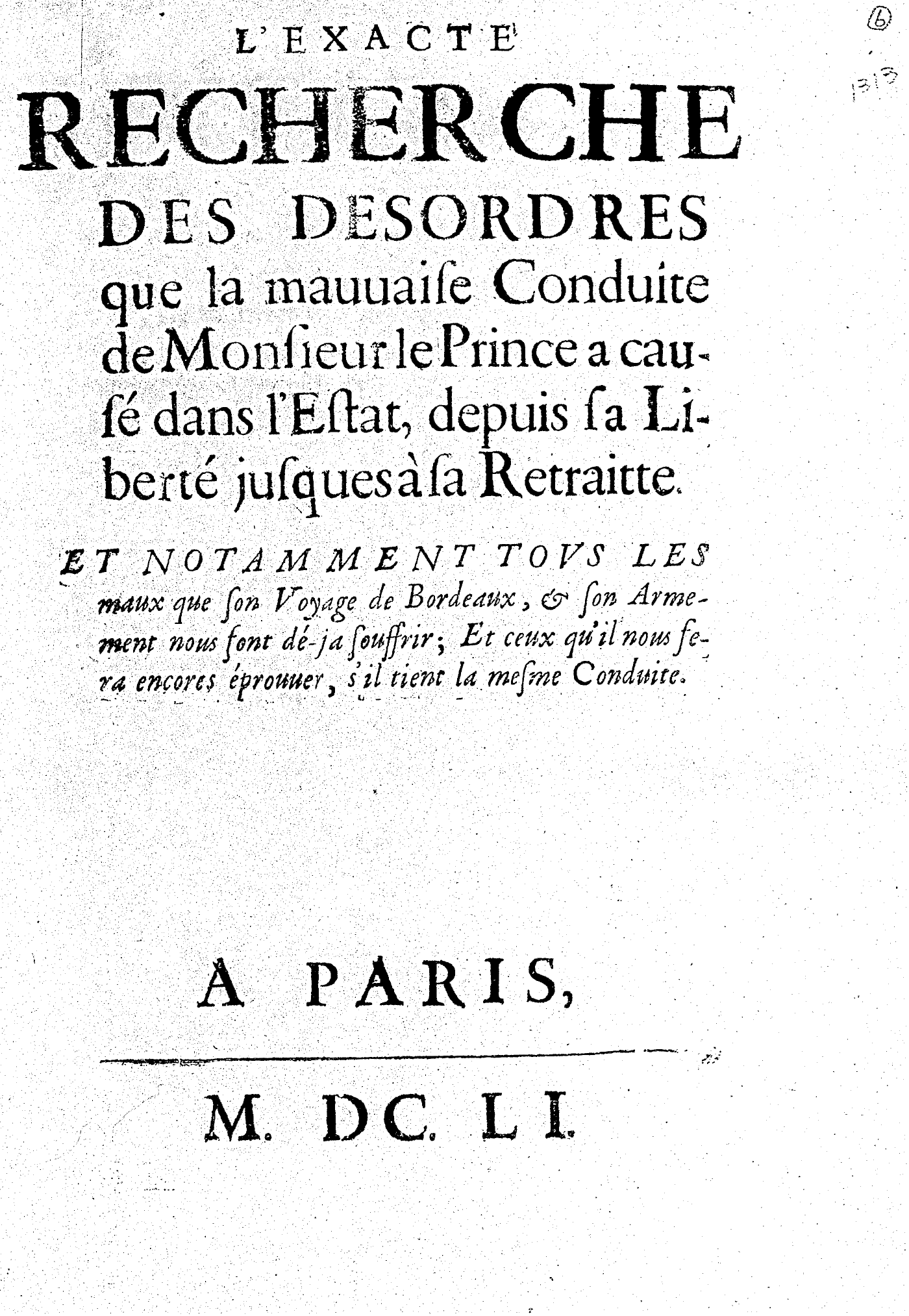 L’EXACTE RECHERCHE DES DESORDRES que la mauuaise Conduite de Monsieur le Prince a causé dans l’Estat, depuis sa Liberté jusques à sa Retraitte. ET NOTAMMENT TOVS LES maux que son Voyage de Bordeaux, & son Armement nous font dé-ja souffrir ; Et ceux qu’il nous fera encores éprouuer, s’il tient la mesme Conduite.