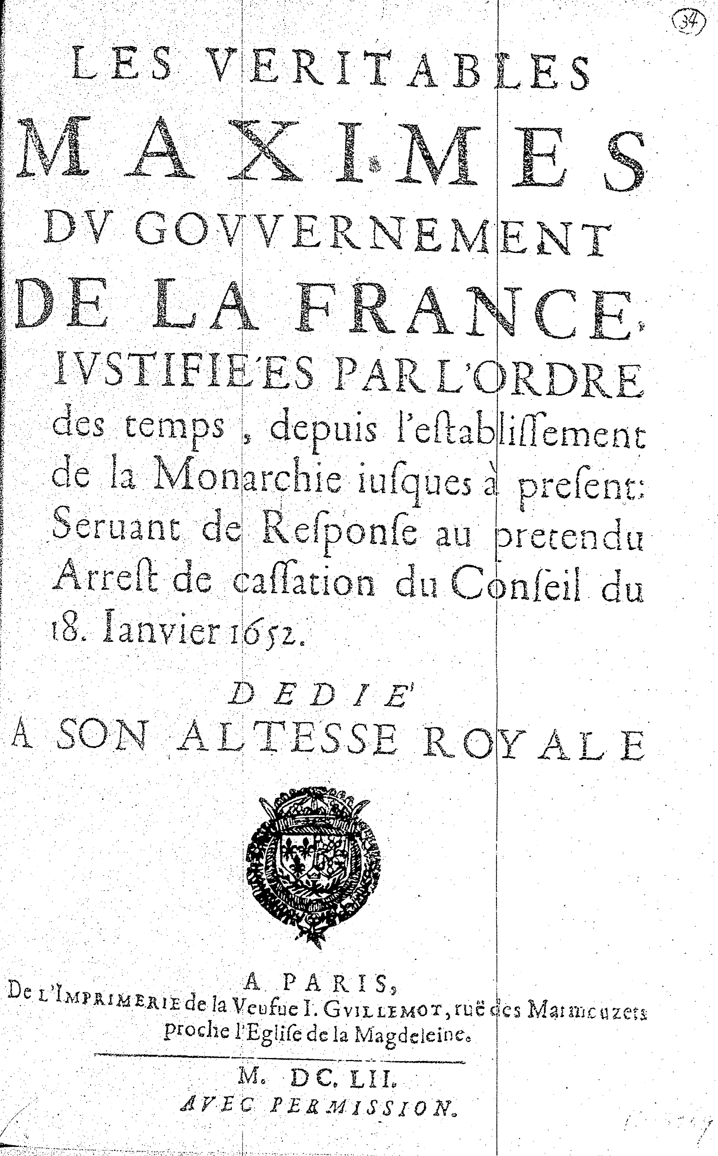 LES VERITABLES MAXIMES DV GOVVERNEMENT DE LA FRANCE, IVSTIFIÉES PAR L’ORDRE des temps, depuis l’establissement de la Monarchie iusques à present : Seruant de Response au pretendu Arrest de cassation du Conseil du 18. Ianvier 1652. DEDIÉ A SON ALTESSE ROYALE