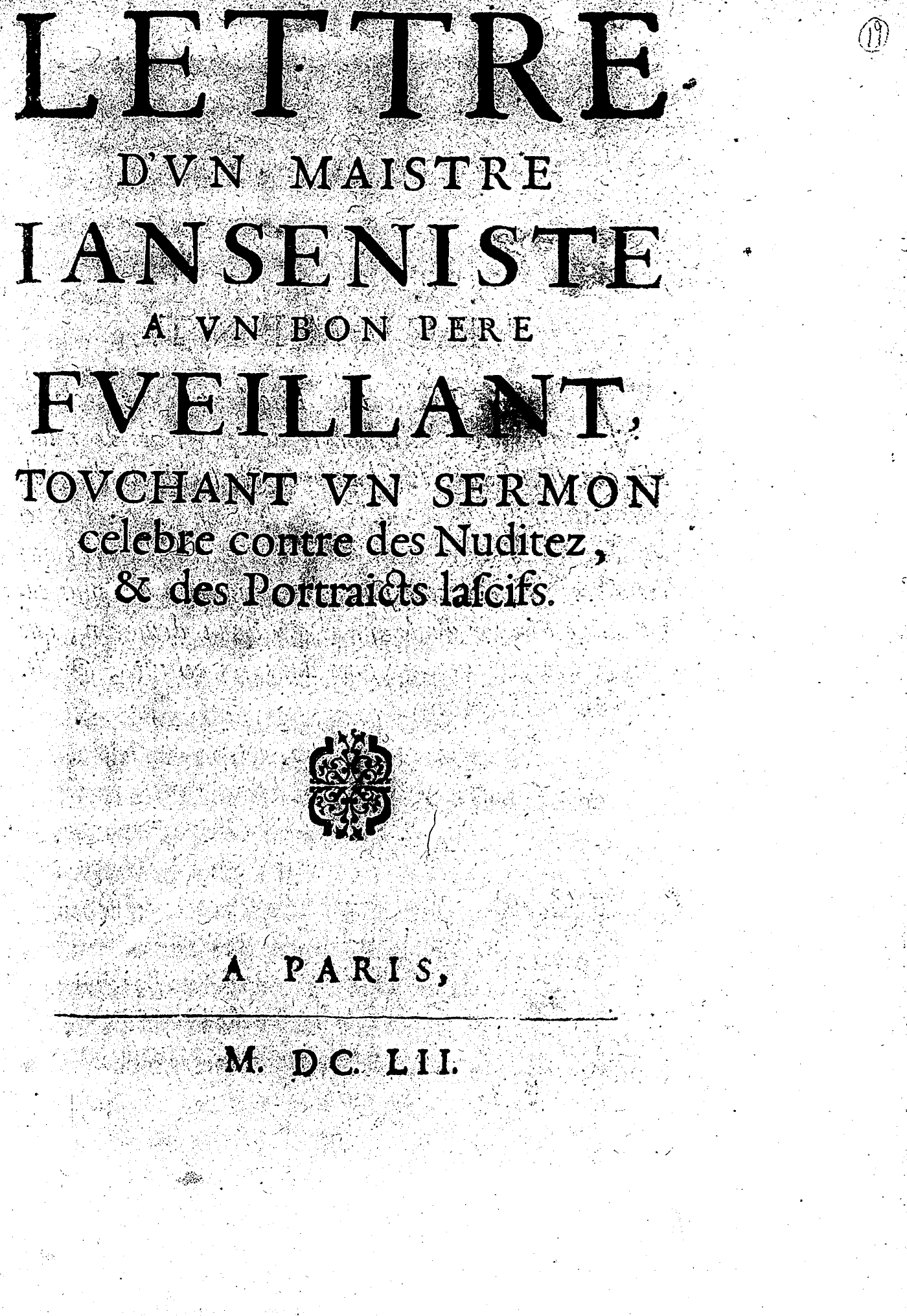 LETTRE D’VN MAISTRE IANSENISTE A VN BON PERE FVEILLANT, TOVCHANT VN SERMON celebre contre des Nuditez, & des Portraicts lascifs.