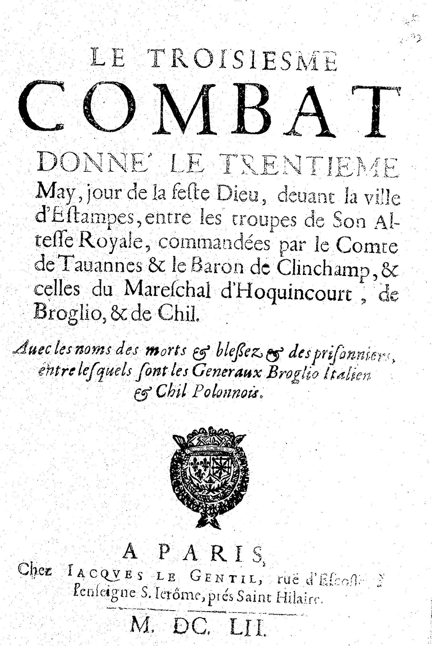 LE TROISIESME COMBAT DONNÉ LE TRENTIEME May, jour de la feste Dieu, deuant la ville d’Estampes, entre les troupes de Son Altesse Royale, commandées par le Comte de Tauannes & le Baron de Clinchamp, & celles du Mareschal d’Hoquincourt, de Broglio, & de Chil. Auec les noms des morts & blessez & des prisonniers, entre lesquels sont les Generaux Broglio Italien & Chil Polonnois.