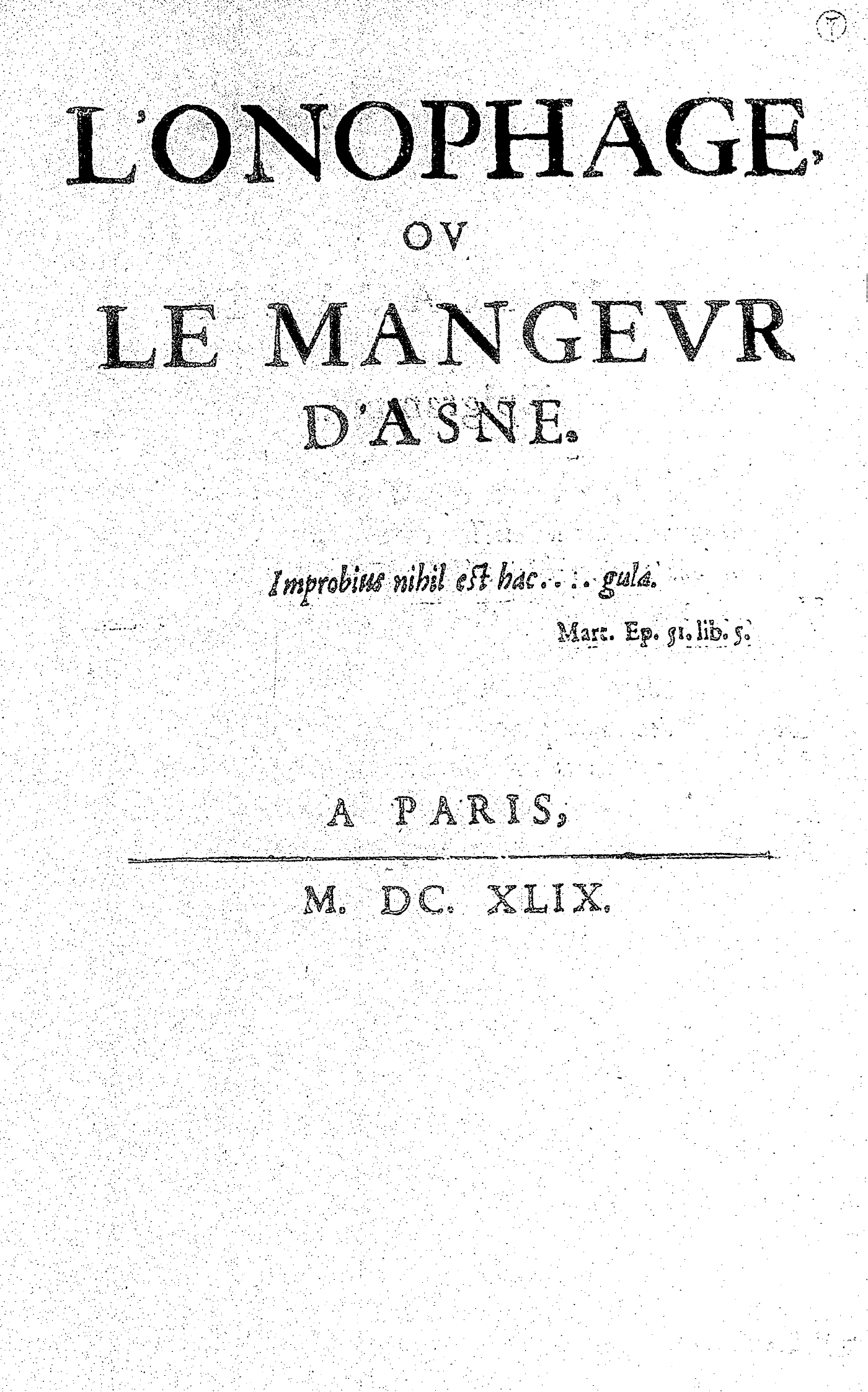 L’ONOPHAGE, OV LE MANGEVR D’ASNE. Improbius nihil est hac… gula. Mart. Ep. 51. lib. 5.