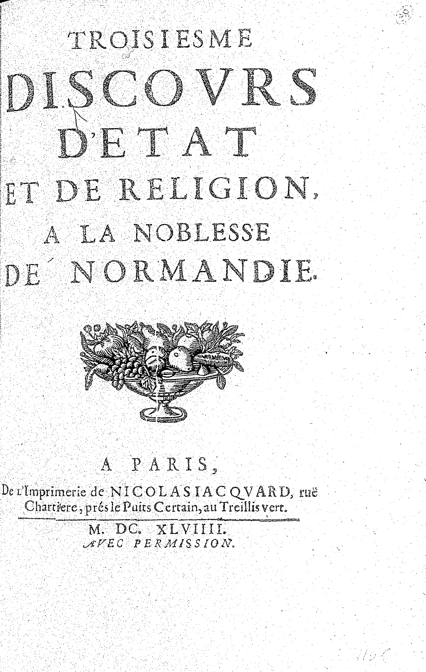 TROISIESME DISCOVRS D’ETAT ET DE RELIGION, A LA NOBLESSE DE NORMANDIE.