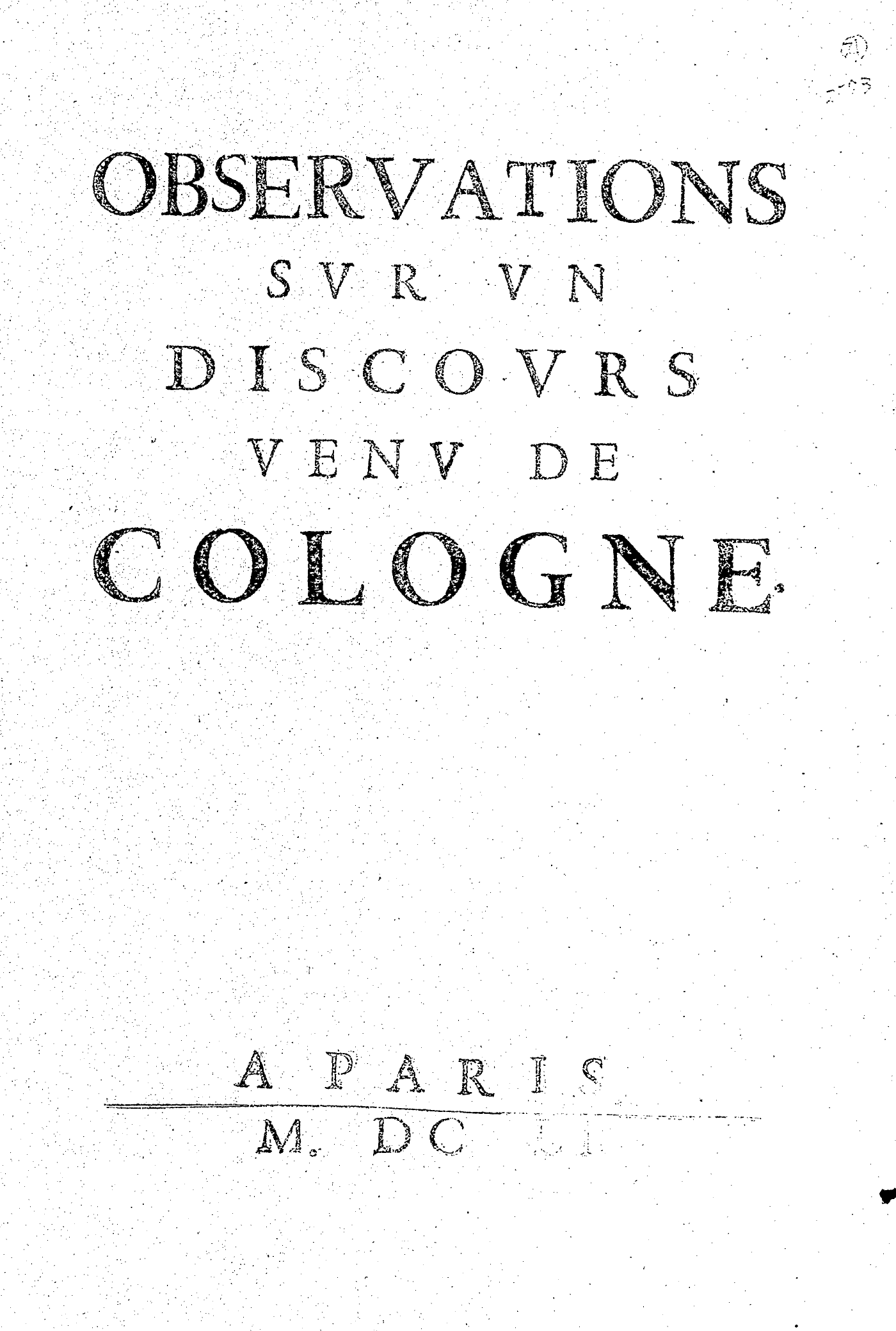 OBSERVATIONS SVR VN DISCOVRS VENV DE COLOGNE.