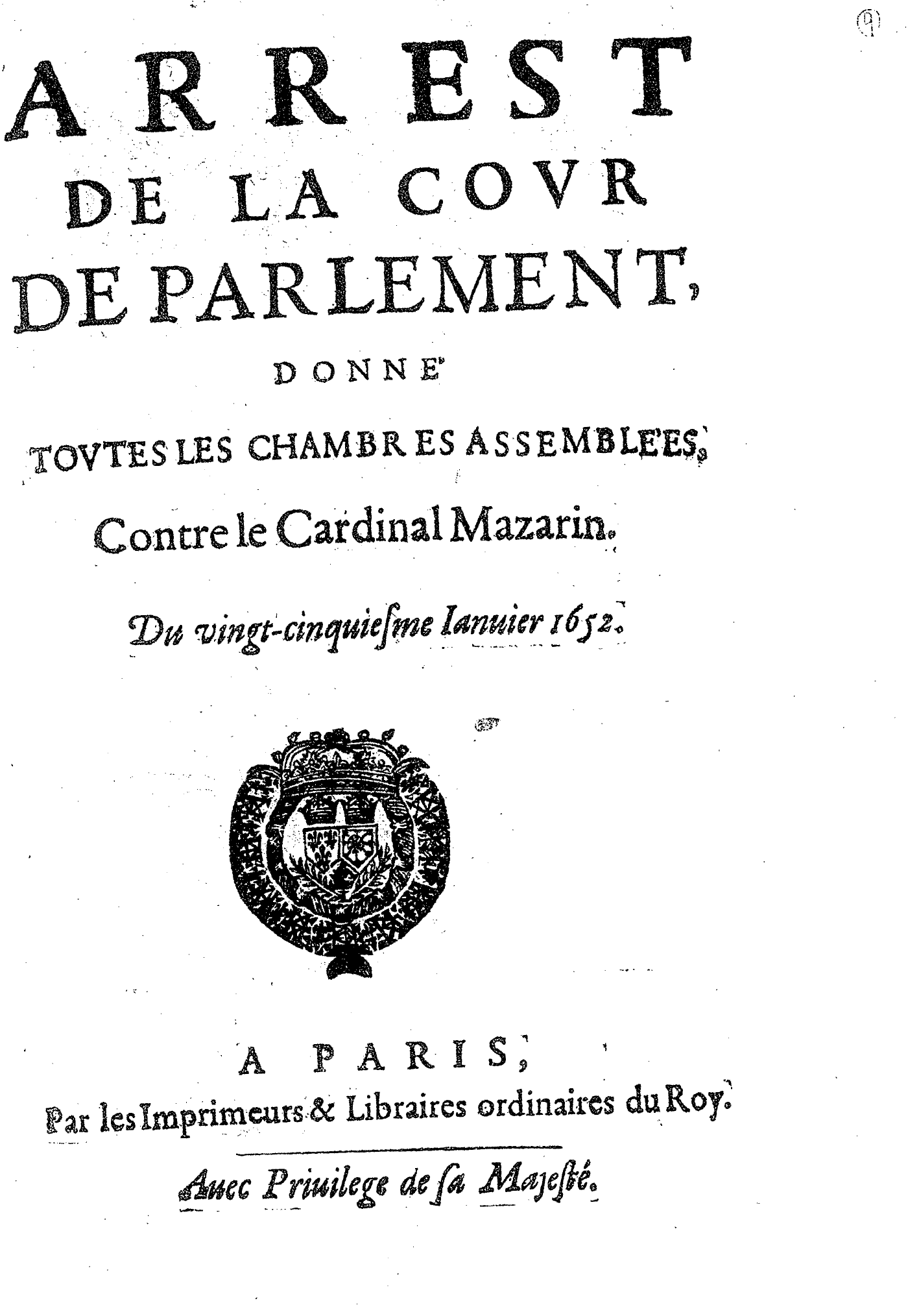ARREST DE LA COVR DE PARLEMENT, DONNÉ TOVTES LES CHAMBRES ASSEMBLÉES, Contre le Cardinal Mazarin.