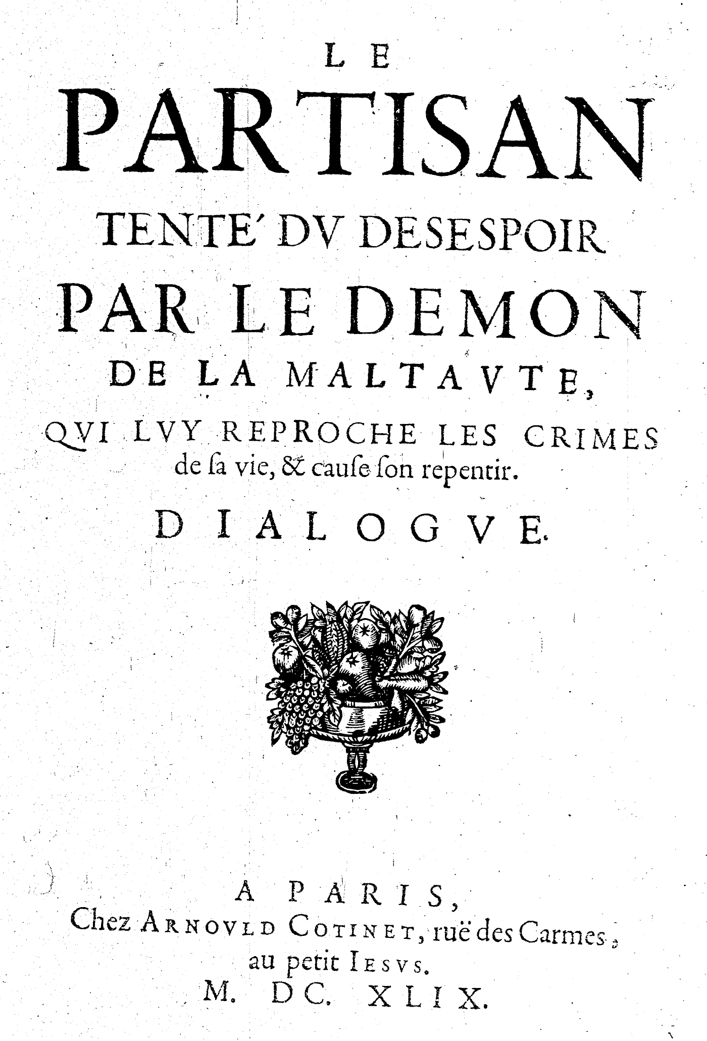 LE PARTISAN TENTÉ DV DESESPOIR PAR LE DEMON DE LA MALTAVTE, QVI LVY REPROCHE LES CRIMES de sa vie, & cause son repentir. DIALOGVE.