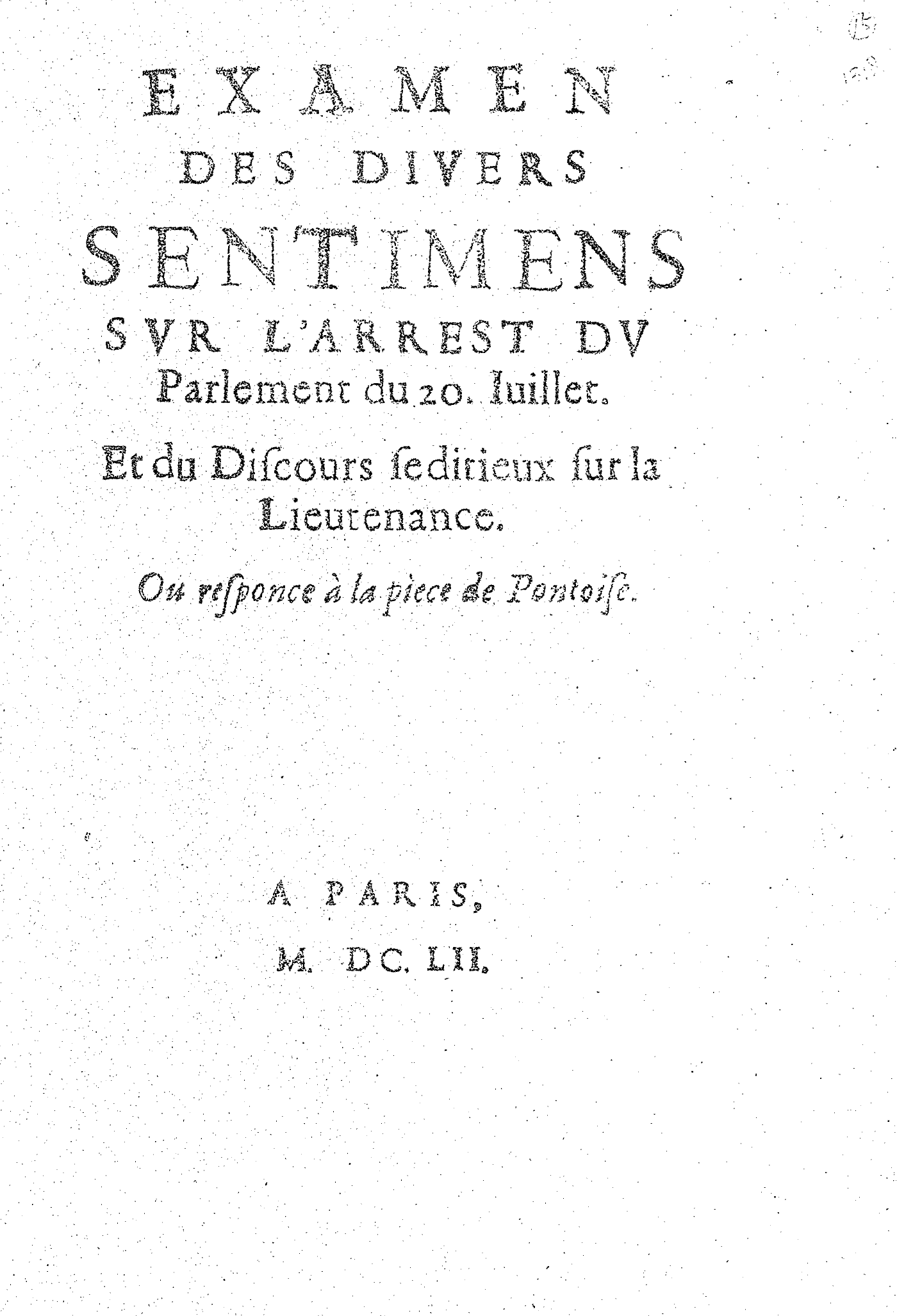EXAMEN DES DIVERS SENTIMENS SVR L’ARREST DV Parlement du 20. Iuillet. Et du Discours seditieux sur la Lieutenance. Ou responce à la piece de Pontoise.