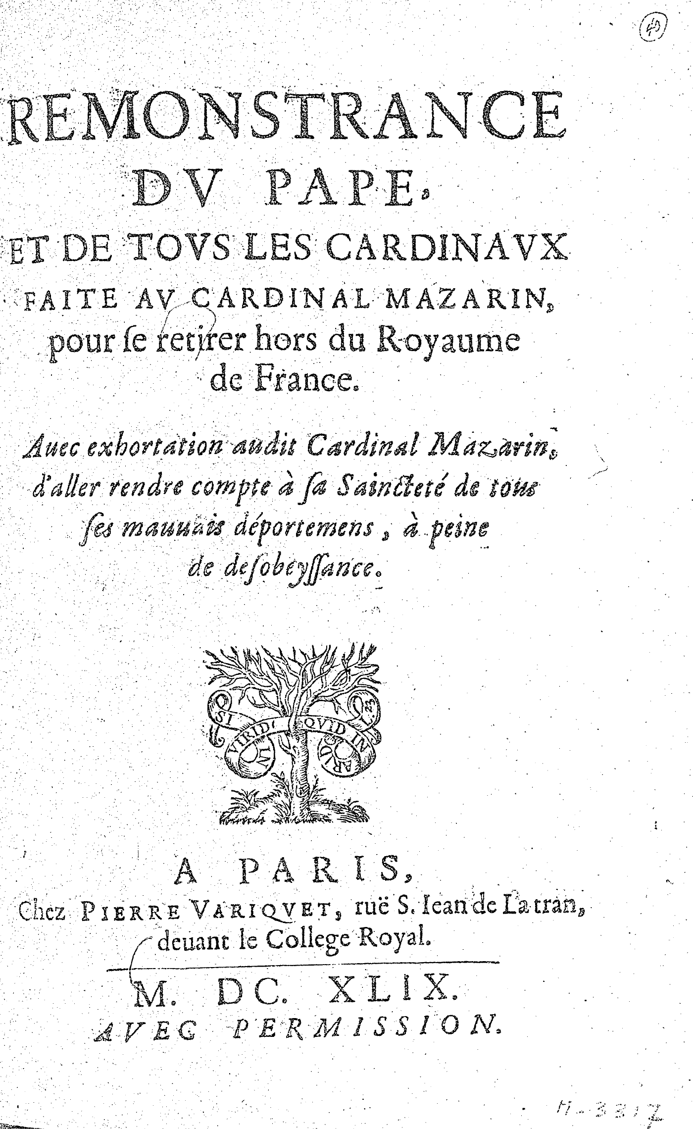 REMONSTRANCE DV PAPE, ET DE TOVS LES CARDINAVX FAITE AV CARDINAL MAZARIN, pour se retirer hors du Royaume de France. Auec exhortation audit Cardinal Mazarin, d’aller rendre compte à sa Saincteté de tous ses mauuais déportemens, à peine de desobeyssance.